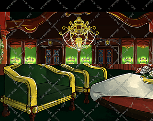 This is a collection of two background illustrations showing a green salon from different angles.