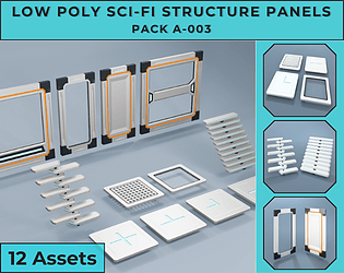 12 low-poly sci-fi structure panels: floors, walls and stairs for modular corridors and futuristic interiors.