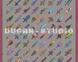 A collection of unique pixel art characters, items, weapons and armour.