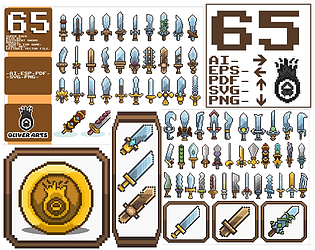 SUPER PACK WITH 65 DIFFERENT SWORD MODELS, ASSETS FOR GAME, PIXEL ART, EDITABLE VECTOR FILE.