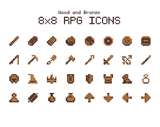 8x8 RPG-themed icons with 3-color palette (wood/bronze/leather)