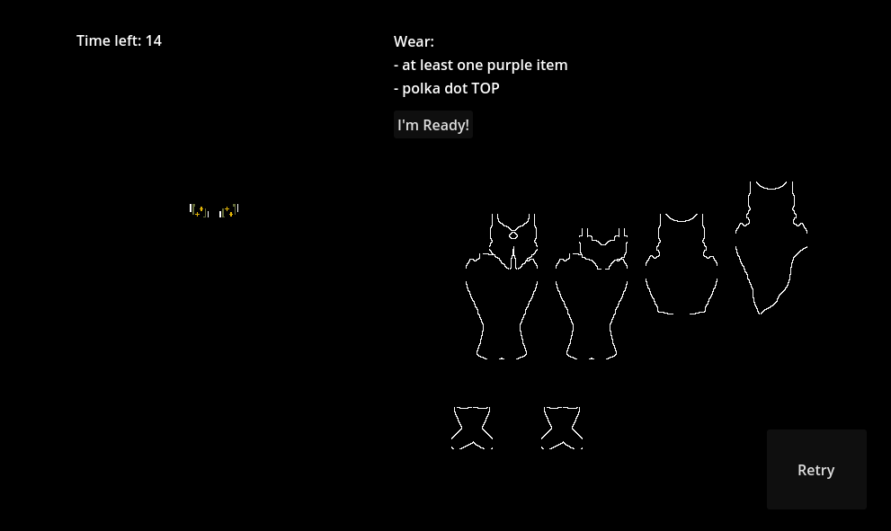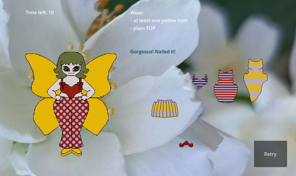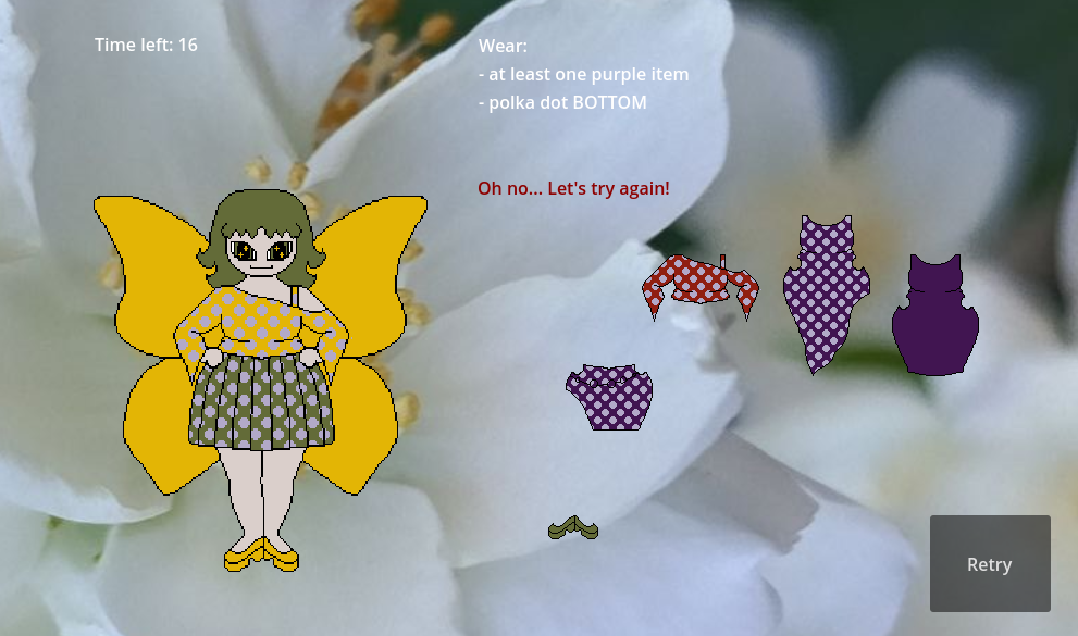 Hi! Thank you for the honest feedback, i appreciate it! Mostly of all that issues - no music, photo as a background is because i couldn't make it in time. I'm planning to improve it in future. Could you please show me screenshots with correct clothing and "Oh no! Let's try again!"? It will help a lot Also i think slightly distorting-looking fairy is my favorite wording now haha