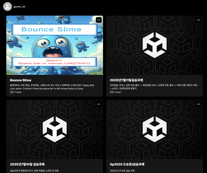 각자의 프로젝트는 play.unity에 올린 프로젝트의 링크만 올리거나, 새로 프로젝트를 업로드 하거나 각자가 원하는 방법으로 업로드를 합니다.