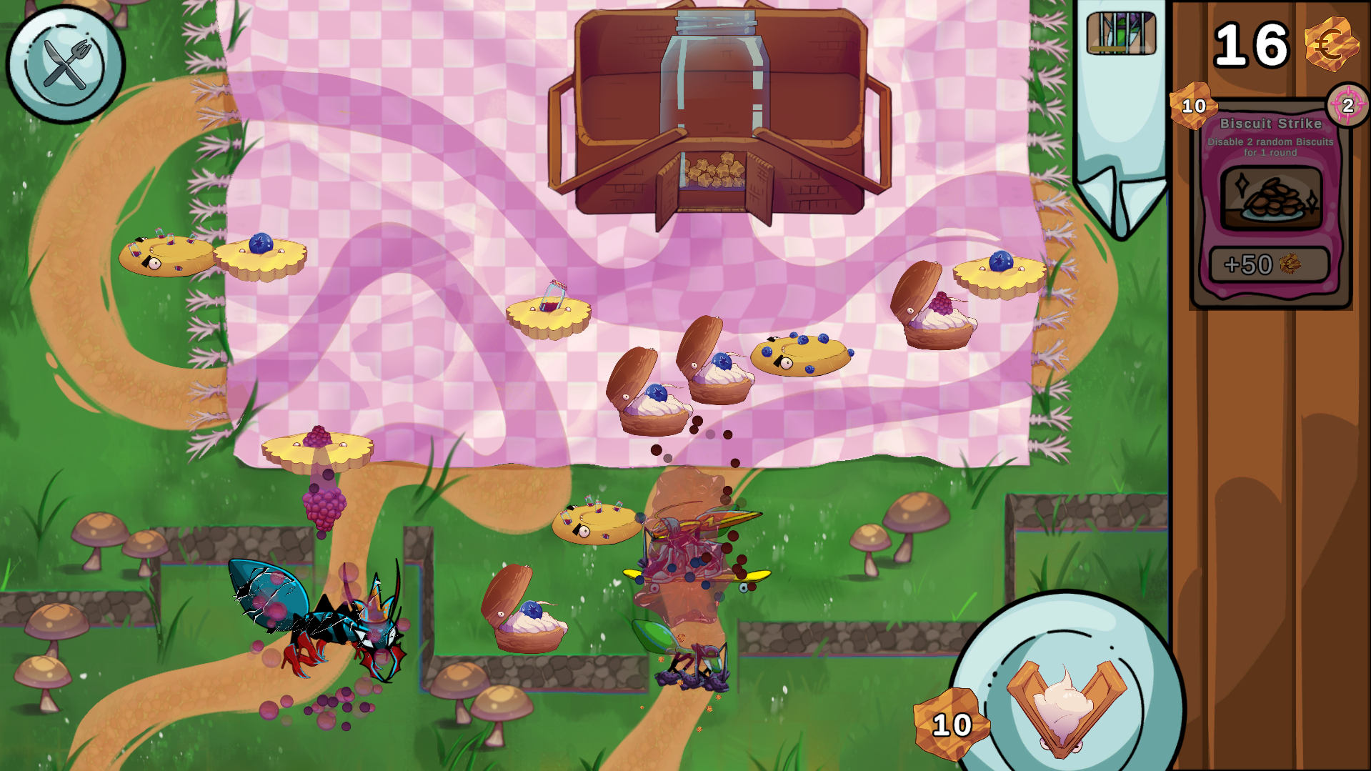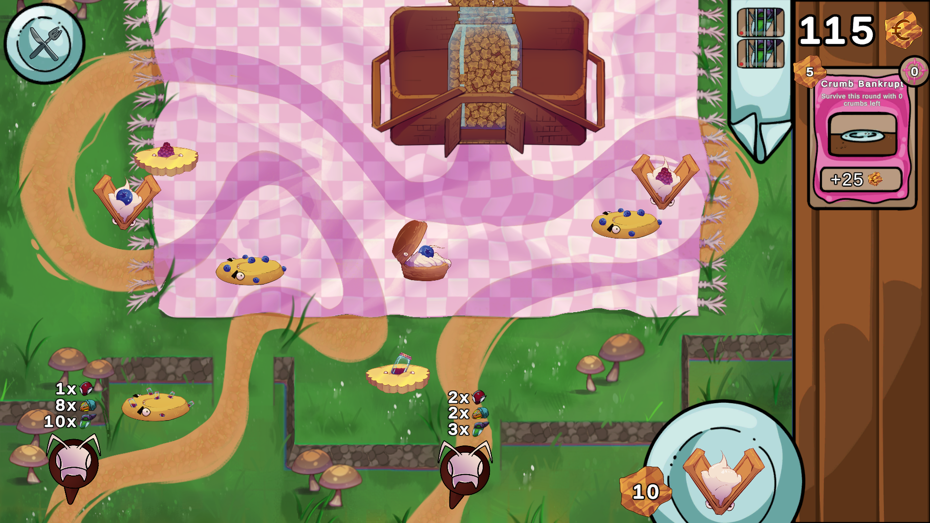 I flipping love the tower defense genre and this one is very interesting. Adding objectives as a way to gamble your crumbles is clever and add another way to insert strategy into the game. The music and sound design are so fun, I love the "bluebeeeeerry" every I add a tower on the map. The design is also super cool, everything's awsome, you're awsome!