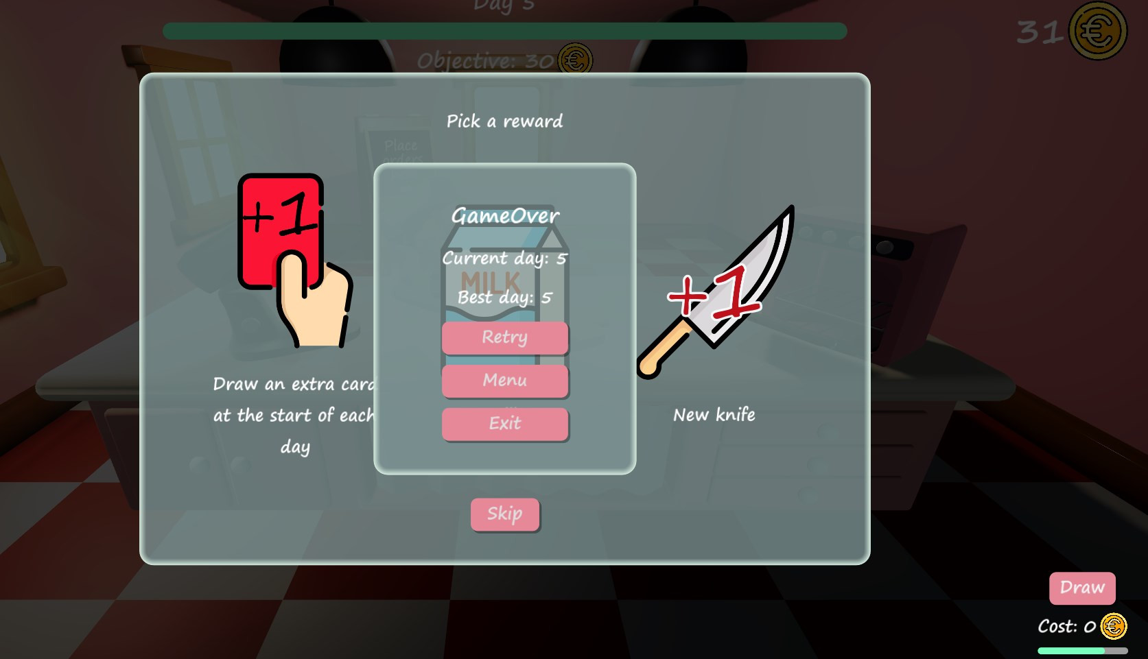 The game is incredibly well polished, snappy, and fun to go through! I loved the almost roguelike elements when it comes to the card system at the end of each day! If I had to give some pointers if this were to be improved, I would decrease the card size as you obtain more, as they obscure a lot of the screen when holding a ton of cards. I would also add a highlight in the recipe menu for the ingredients on hand, and highlight the item itself if it can be made. Adding a couple of alternative soundtracks to the baking section can make the tracks seem less repetitive, although this is more of a nitpick than anything. Nonetheless, this is highly impressive and I wish the team the best in their gamemaking careers!