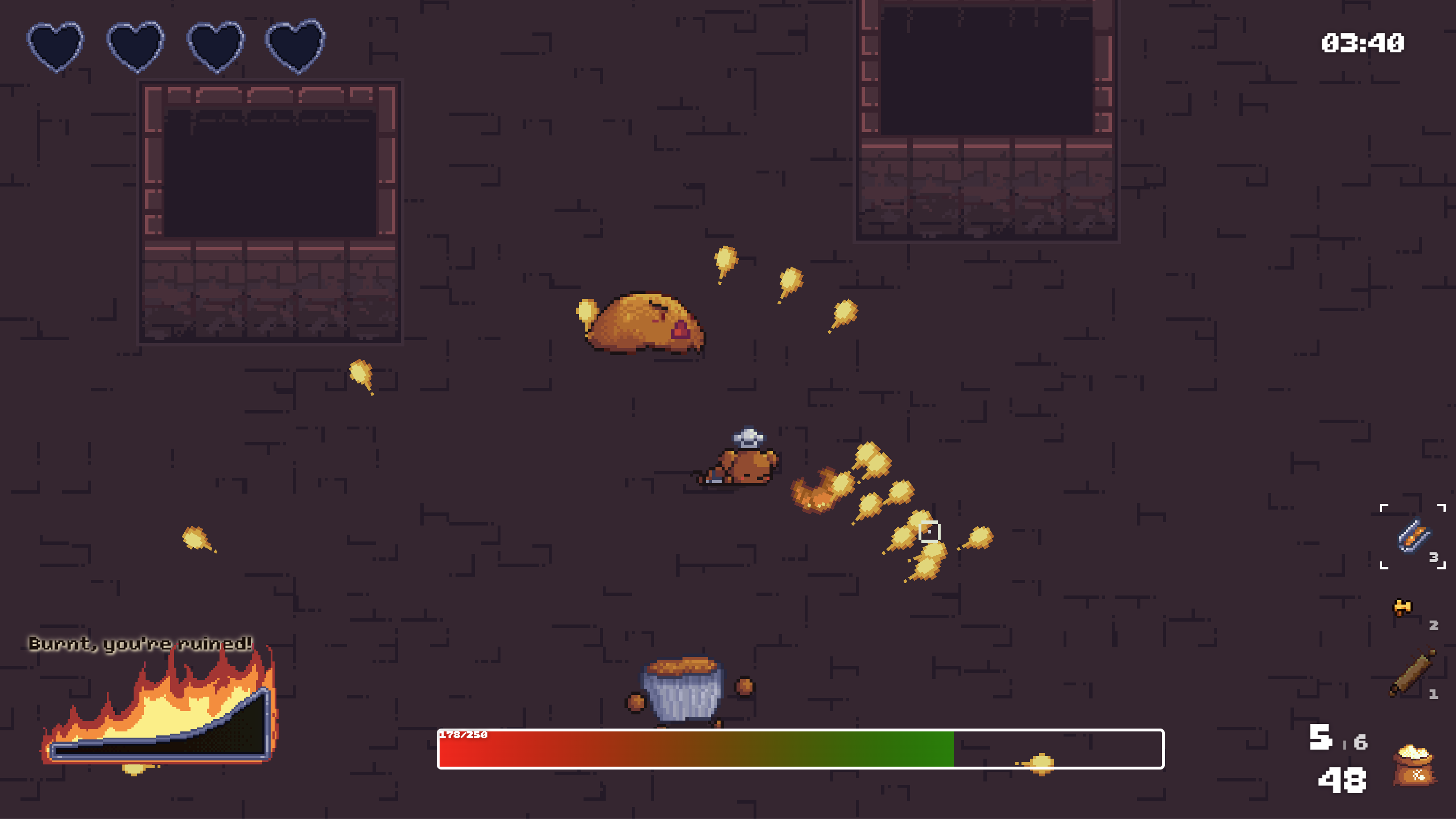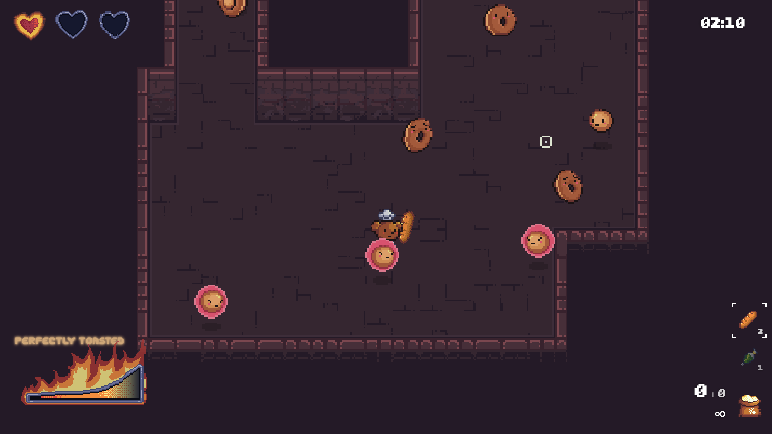 This was such a good game, you nailed the roguelike bread dungeon vibes. The weapons were interesting, the enemies were adorable, the boss was so well designed. My best time was 1:04 thanks to the croissant, but I also had plenty of fun exploring the maze and taking my time. Overall, perfectly toasted game! I can't wait to see where you may take this