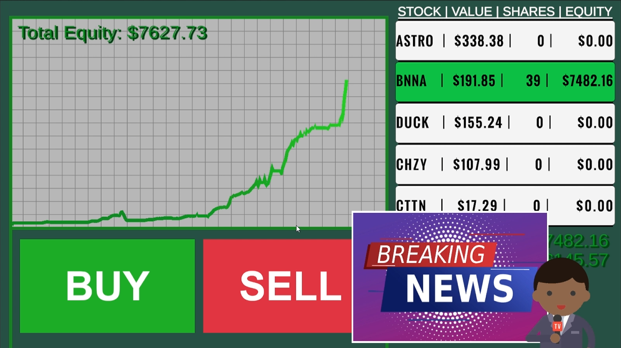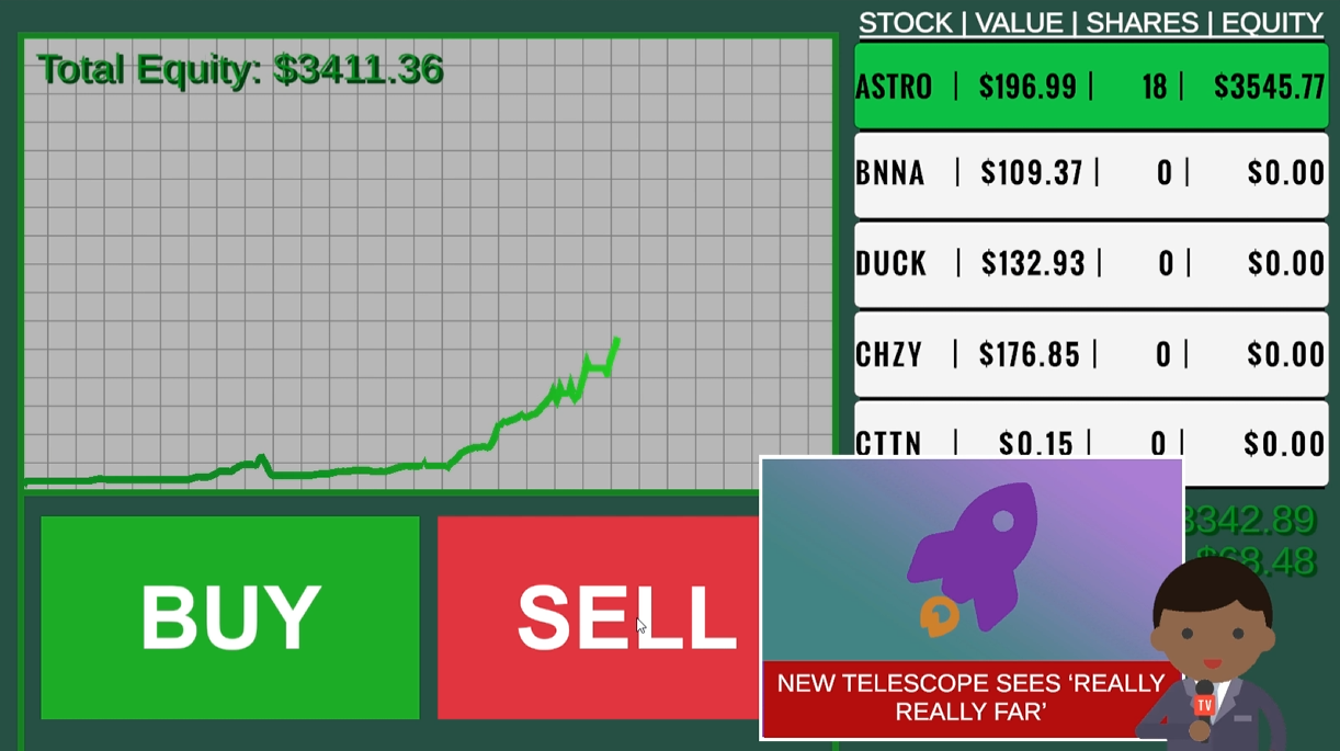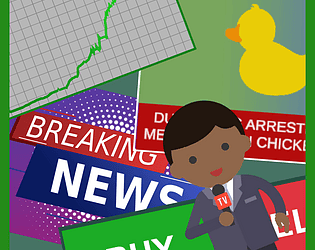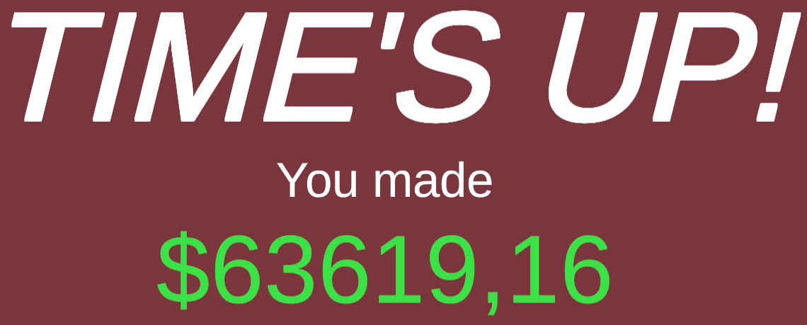 Goofy game with great theming! I started low and was taking a while to get rolling, and then the duck stock dropped to no money, I bought a lot, I lost a lot, and then my equity went directly through the roof! It was a bit easy is kinda what I'm saying (maybe not having the stocks spike so majorly and also having a bit more of that risk/reward element?), and the news broadcasts constantly popping up obscured the stock legend. Of course, sound effects would've been nice. Overall though,I had a good time trading some silly stocks!