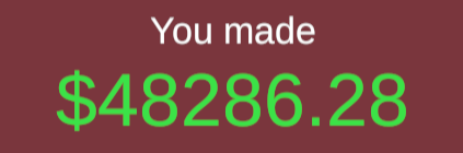 A simple but such a fun game! Not gonna lie, I didn't think I was gonna love a game about stock that much. I got 16166,17$, no idea if I did well or not x) A leaderboard would be an amazing upgrade to your game! But really, it's a superb work, especially since you did it all by yourself. Congrats!