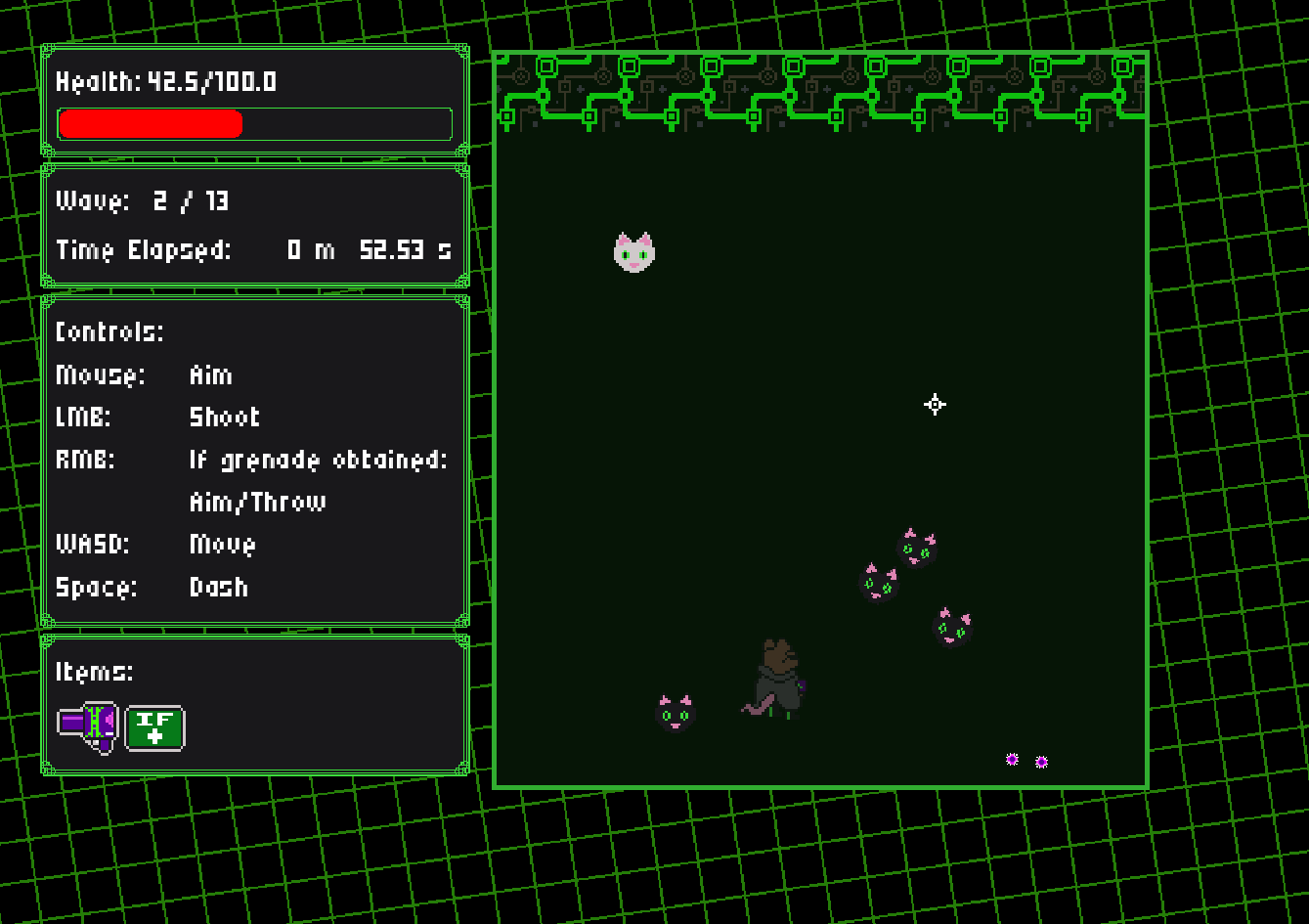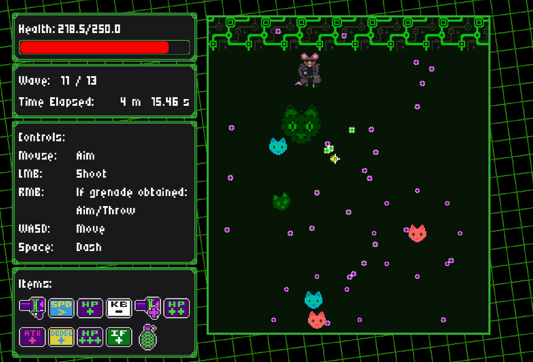 Mouse and cats was nice (have got some mice starting to infiltrate nearby) - although, maybe have some more options than just keeping pressed the mouse button for firing? Not really familiar with these kinds of games, but like, the more damaging shot the longer you don't fire?