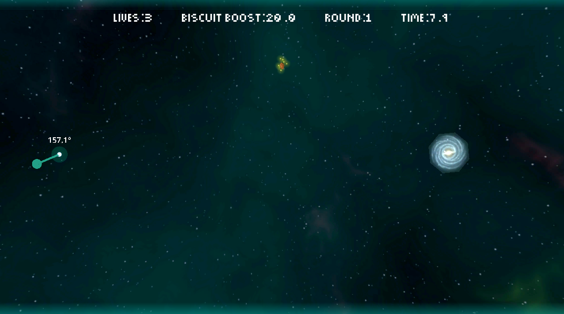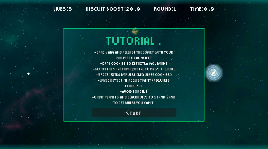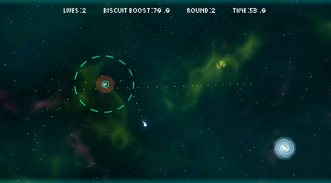 The player needs to launch a comet in the correct trajectory to get cookies and pass levels. Cookies are not necessary, but if you get them you also get boost and extra precision movements that will definetly help the player to pass levels, specially when calculating trajectories of moving bodies is that hard!