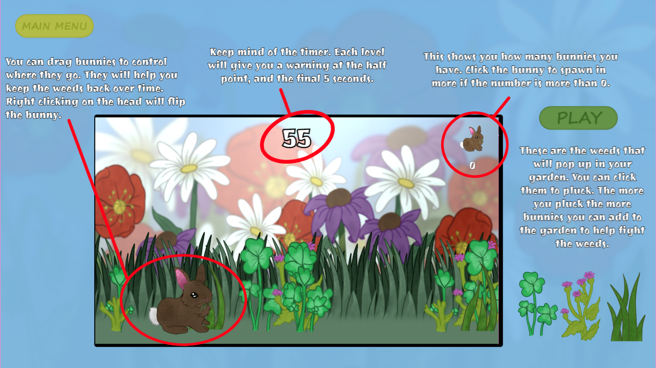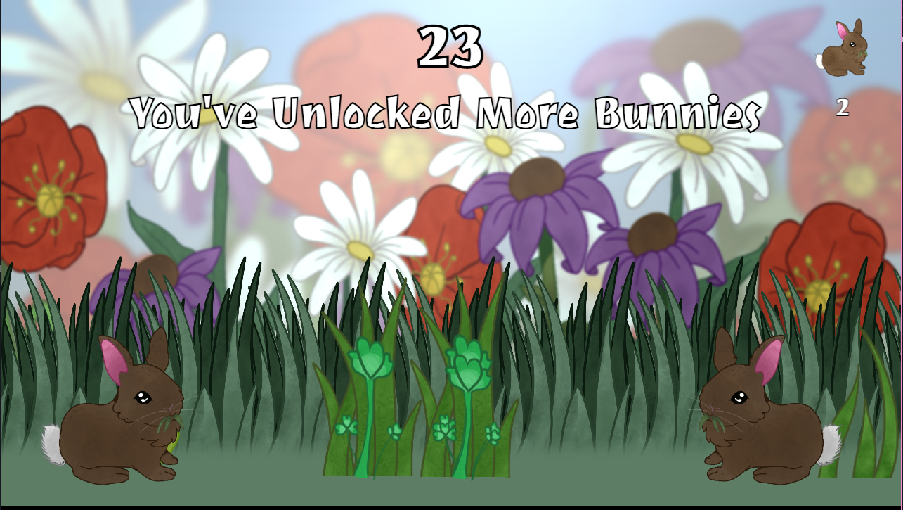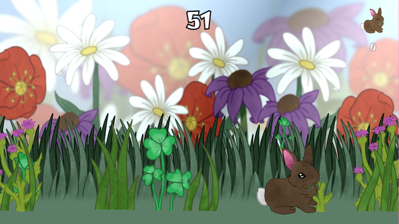 I really love the bunny, and the hard mode is genuinely challenging controlling the rabbit back and forth was tough but very fun! The game is super cute, and I really love the idea and the artwork!