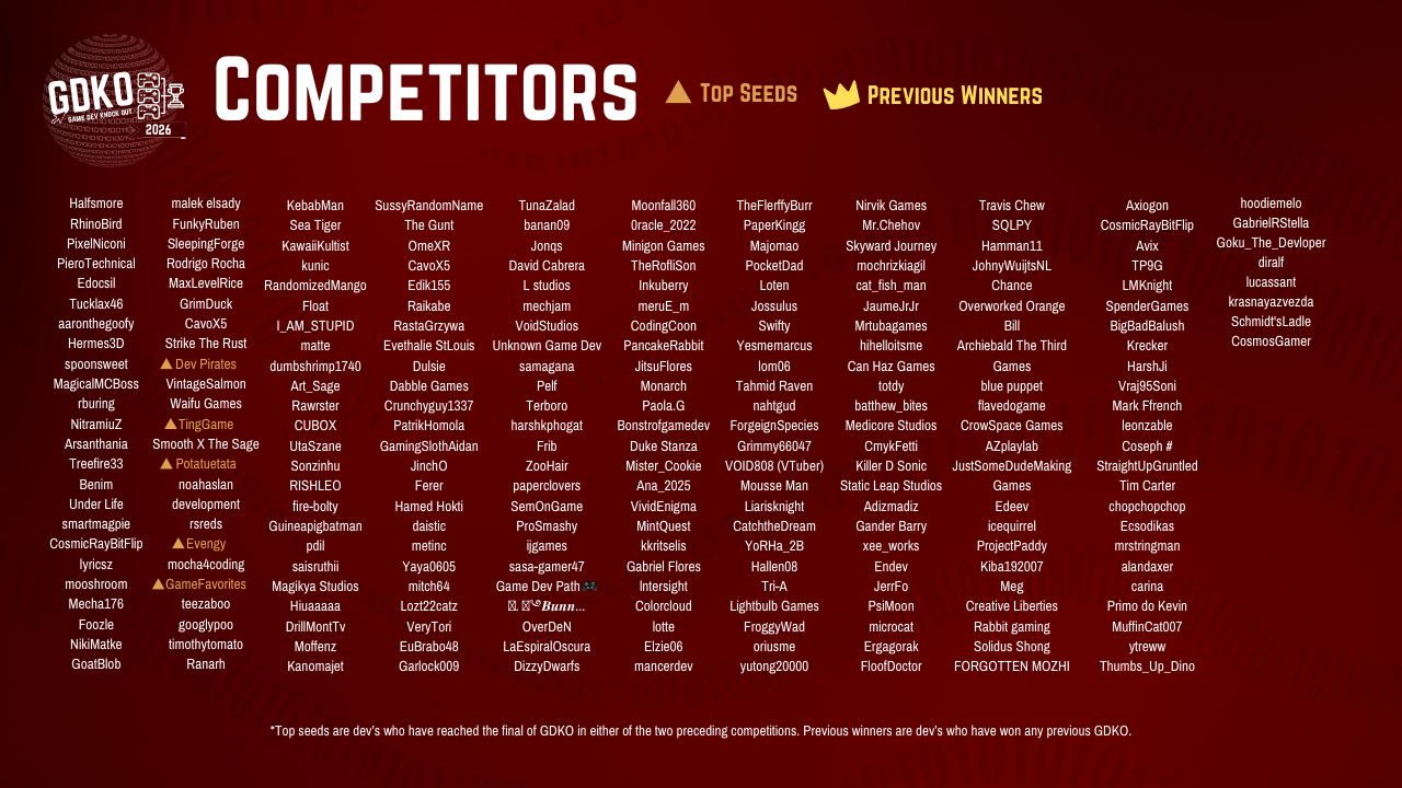 Welcome to GDKO 2026Game Dev Knock Out (GDKO) is an elimination tournament for game developers of all skillsets. It's played out over 4 rounds between January and April with the game developers with the lowest scores being eliminated each round. Think of it as the Squid Games of the game dev world with a less valuable prize and nobody dies.