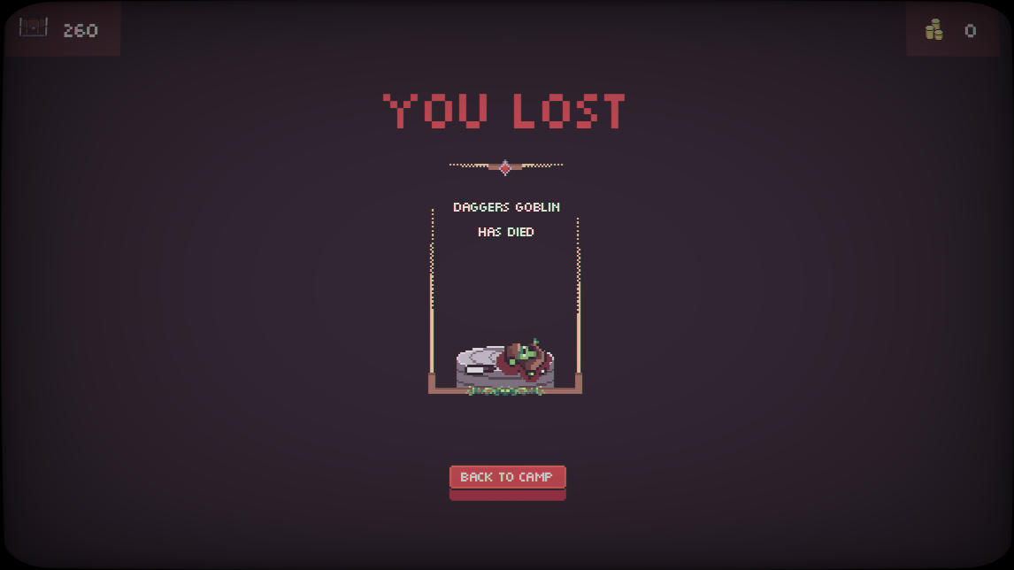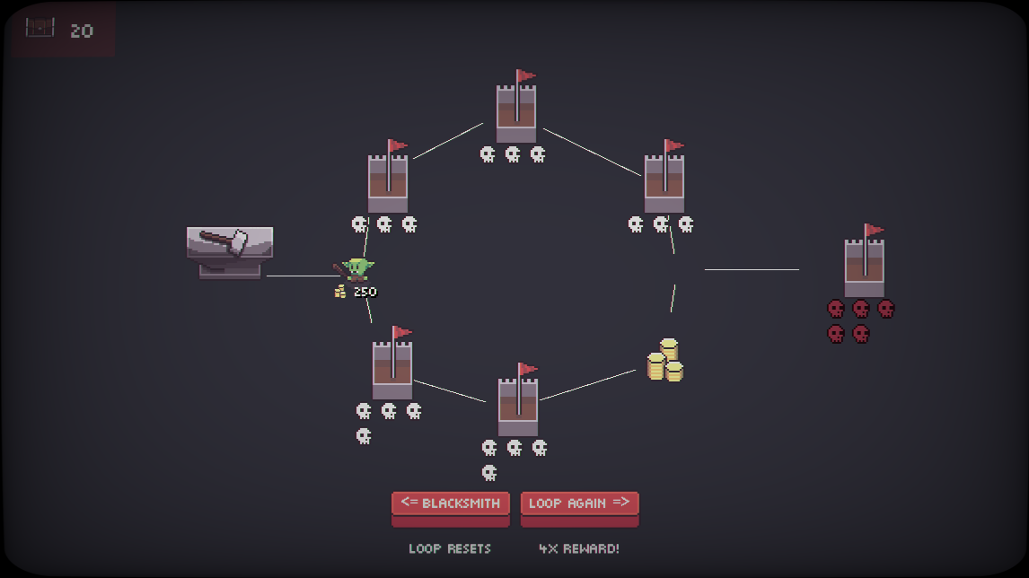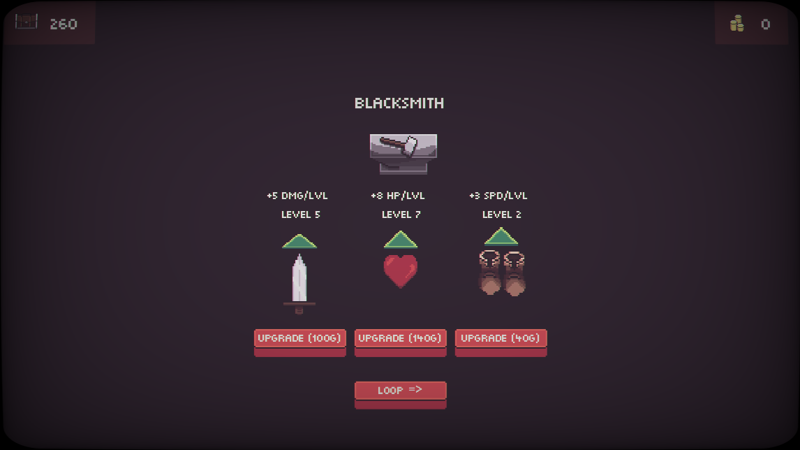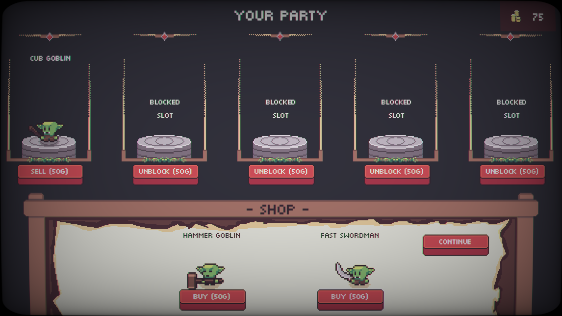 I love the music and art style! The gameplay is also really fun and addictive! One suggestion I have is to maybe make the shop sell better goblins as the loop counter increases.