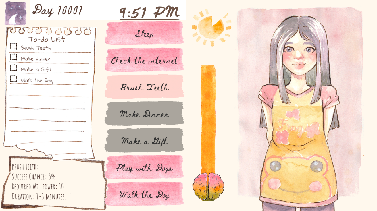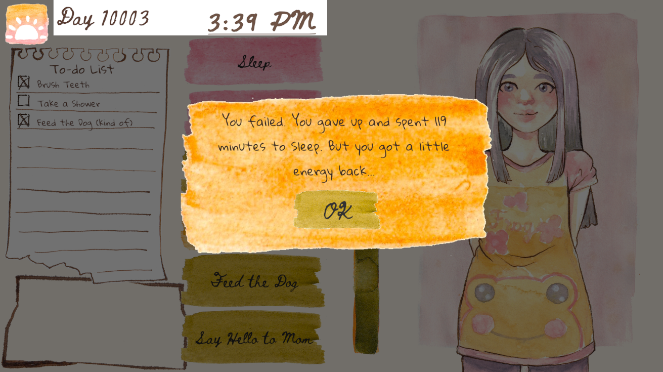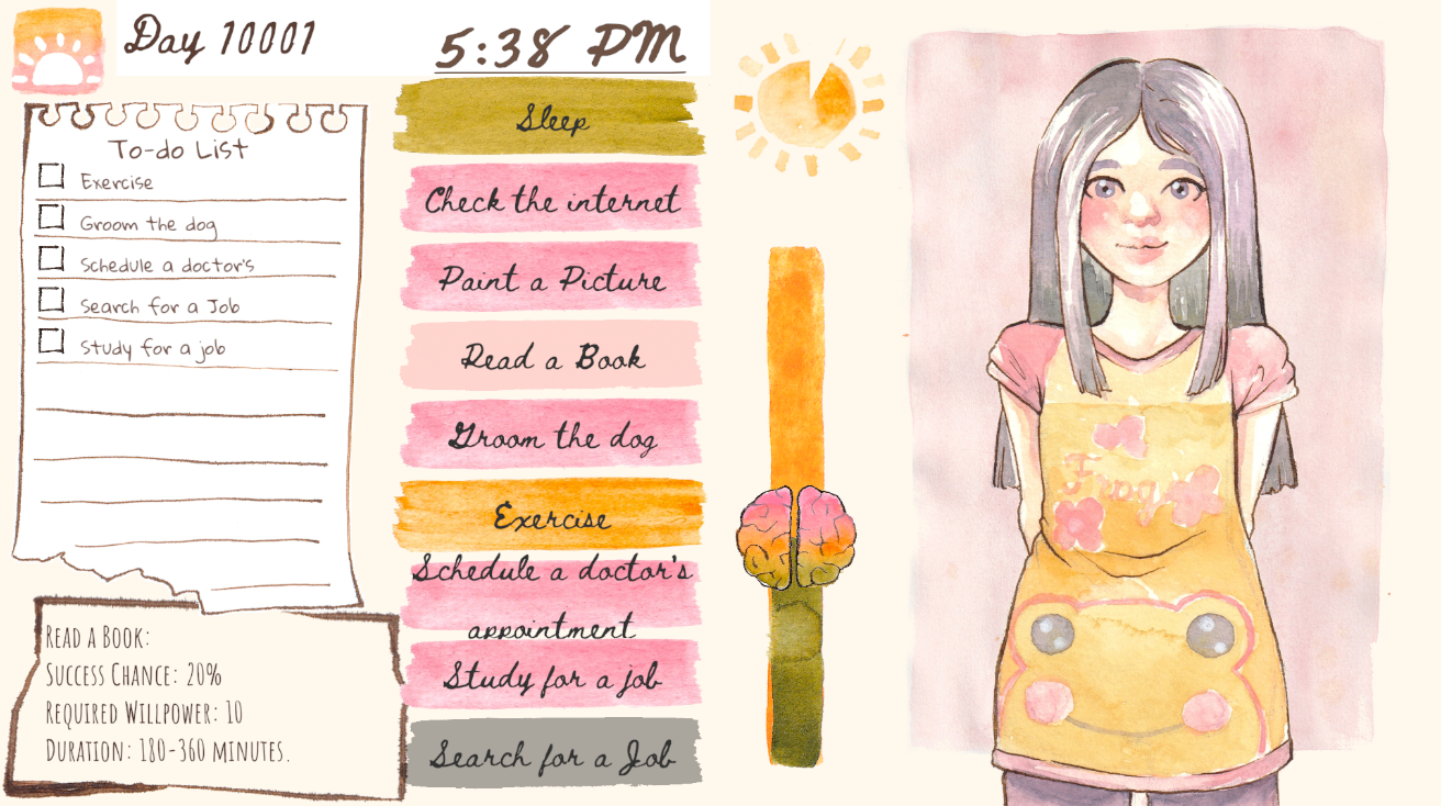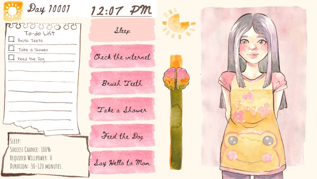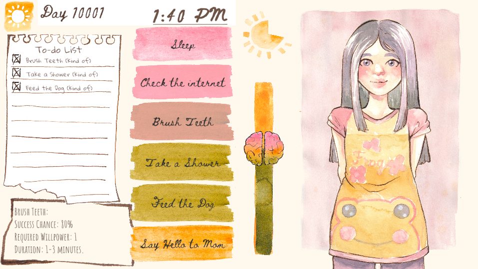 Thank you very much, I appreciate you taking the time to play! And thank you for your feedback, I really, really appreciate hearing your raw impressions. I wasn’t able to convey my full concept with the time I had, but the dichotomy between the cheerful presentation and struggling with basic tasks was actually intentional. One potential title I considered was even “The Luckiest Girl”, haha. It’s not meant to depict depression, but a different condition; I’d wanted to reflect the incongruity of life when your actions, feelings, thoughts, and self-image don’t seem to align. I had to cut a lot of half-finished features (mood meter, thought reader, self-image), so I was a bit sad that probably not even a hint of my original concept showed through to the end, so your comment made me really happy. Even if it’s just a little, I’m glad that some piece of that survived, and hope I can develop it further on my own so it expresses my idea properly :) !