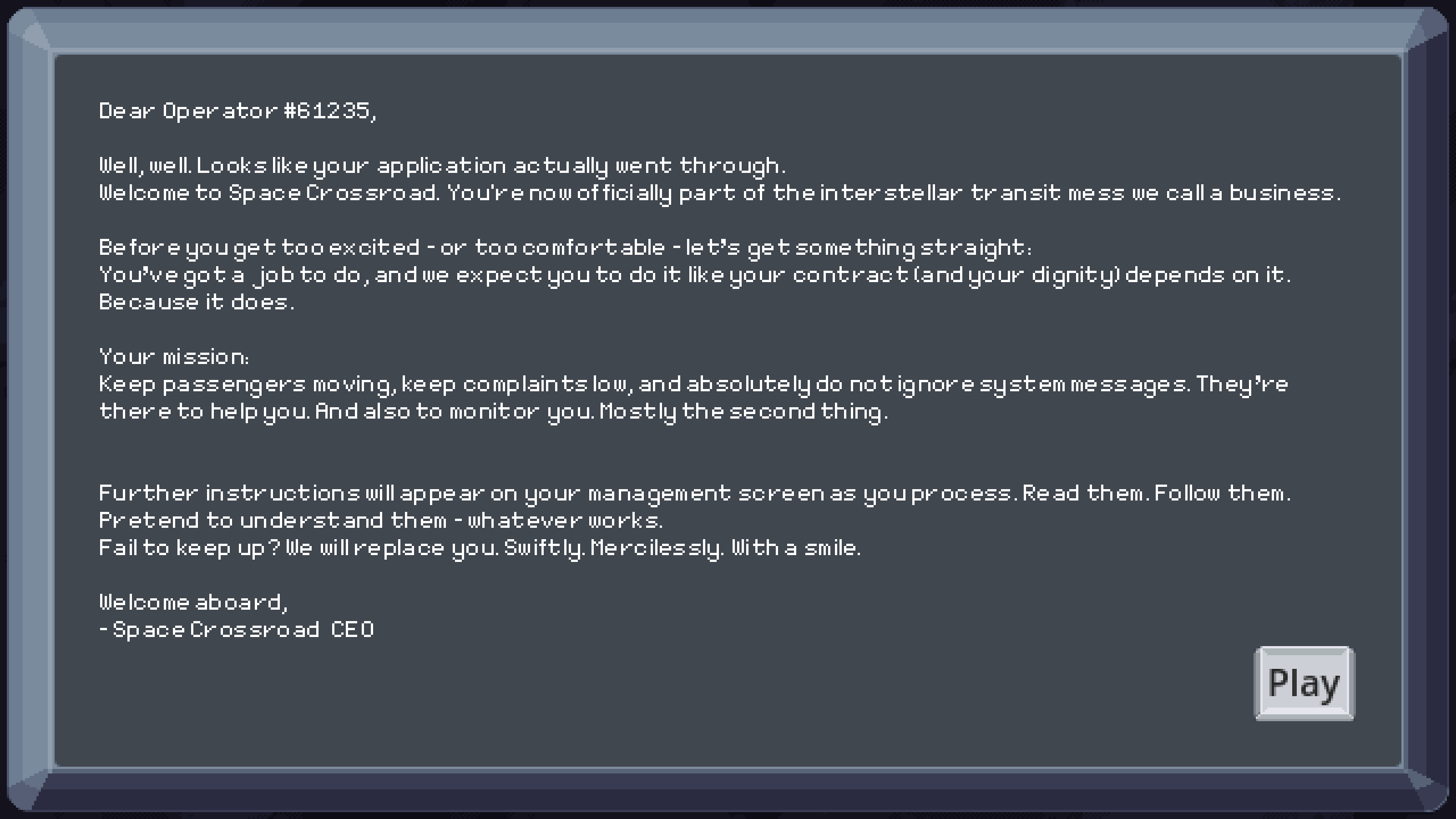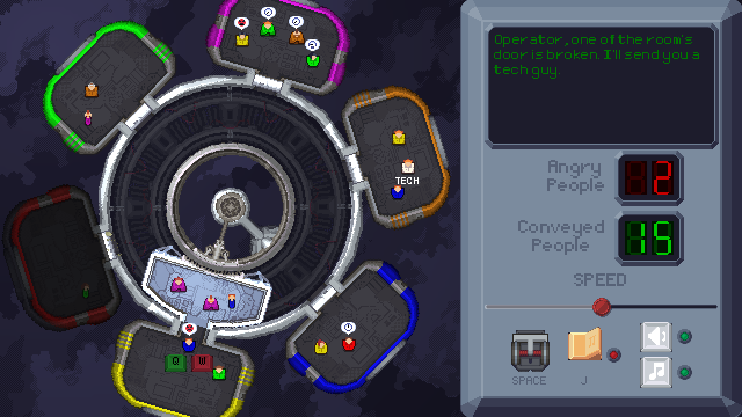 A lovely concept elevated by the awesome voice over. The occasional elevator malfunctions and requirement to prioritize angry customers forces you to put out small fires as the game goes on, which I think is the strongest element of the gameplay. If you expanded on this game, I would love to see even more things going wrong to make the game a bit more chaotic, like in Overcooked, for example. Keep up the good work!