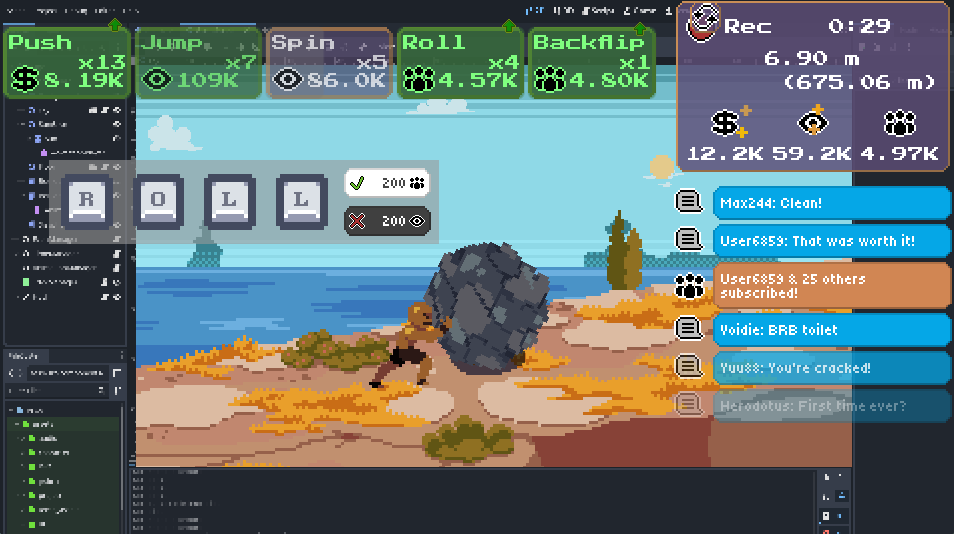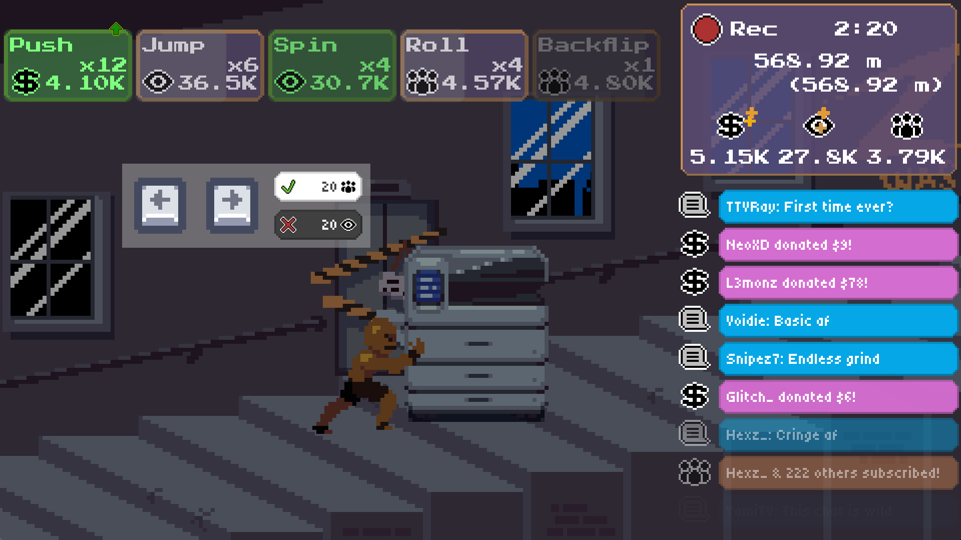 I was sure to find a game about Sisyphus somewhere given the theme of the jam, and here it is! Your concept is very creative, and the streaming interface with all the references to antiquity and to common chat tropes, that is gold !