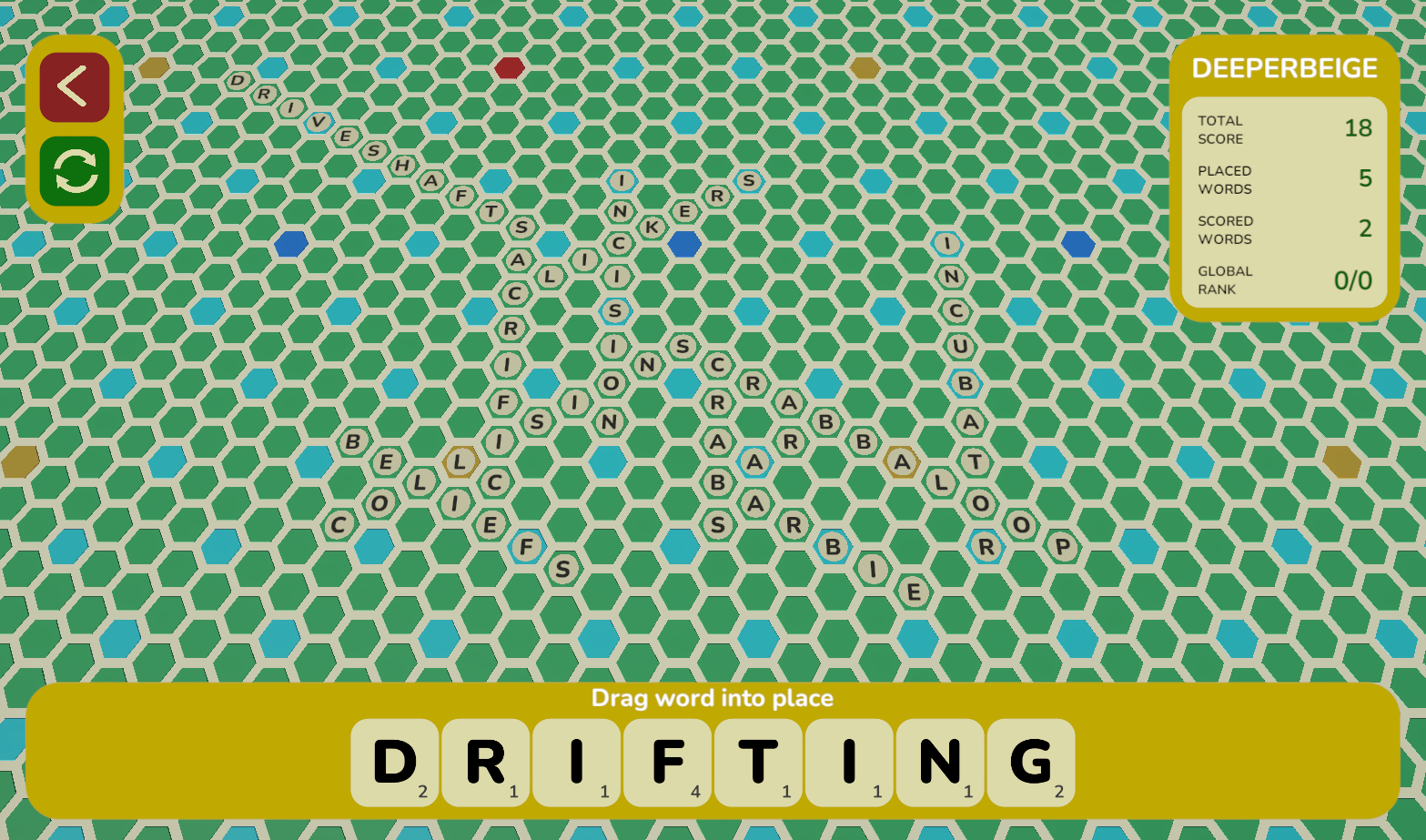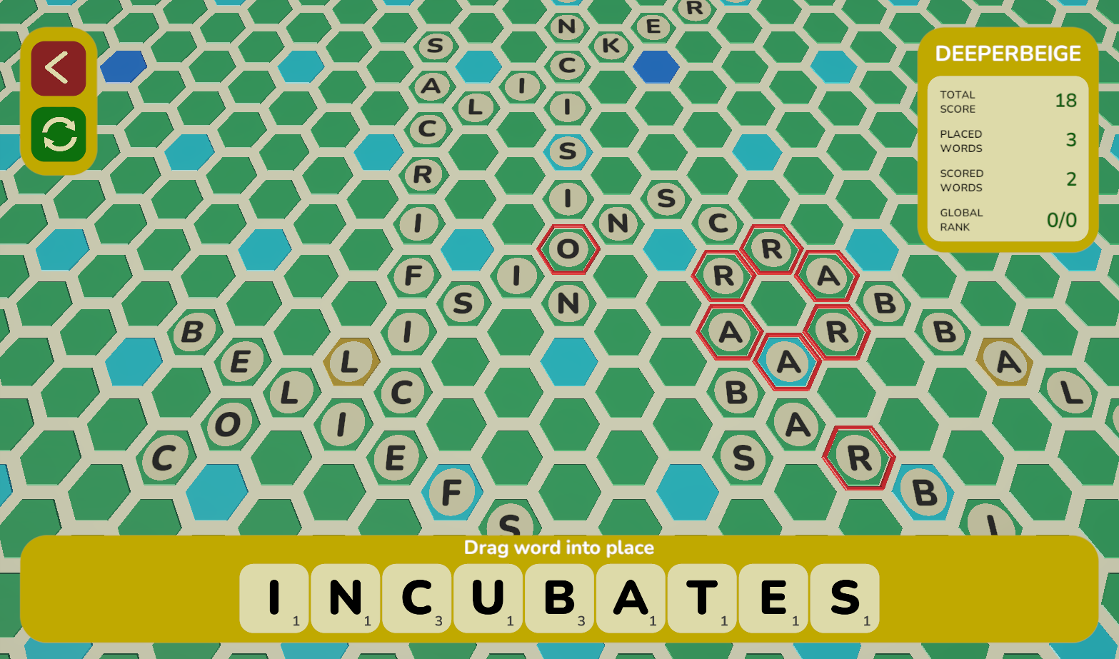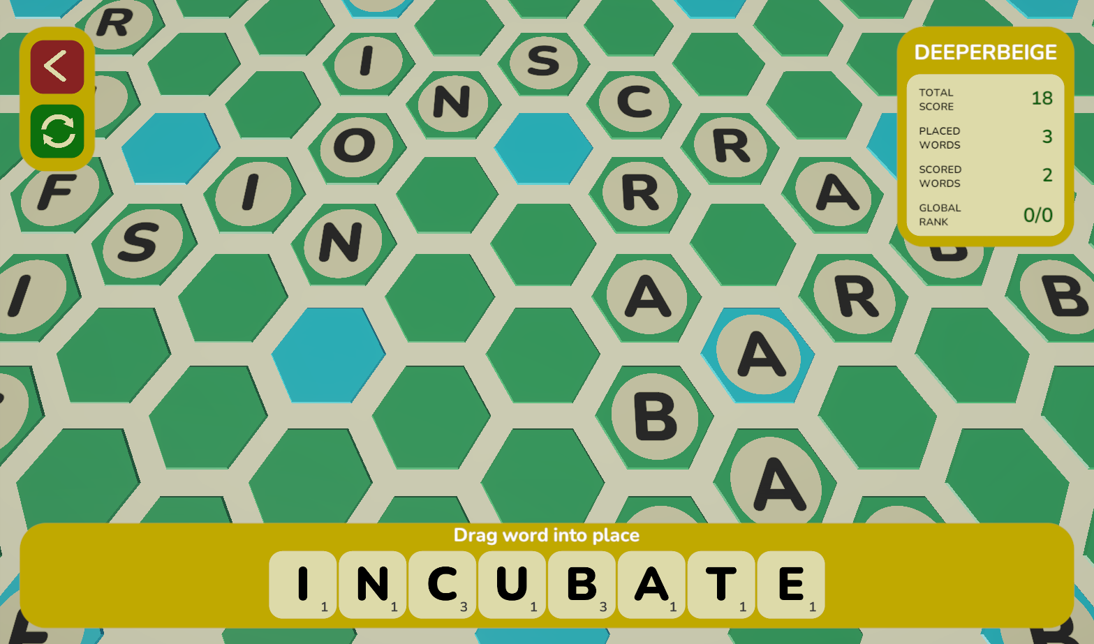 Not sure when my words will get scored, and it took a while to figure out I had to overlap my tiles, but I had quite a lot of fun with this :) Very unique and definitely captured my attention for more than probably any other game, although I did used to play a lot of scrabble so trying to figure it out in this hex grid was pretty fun