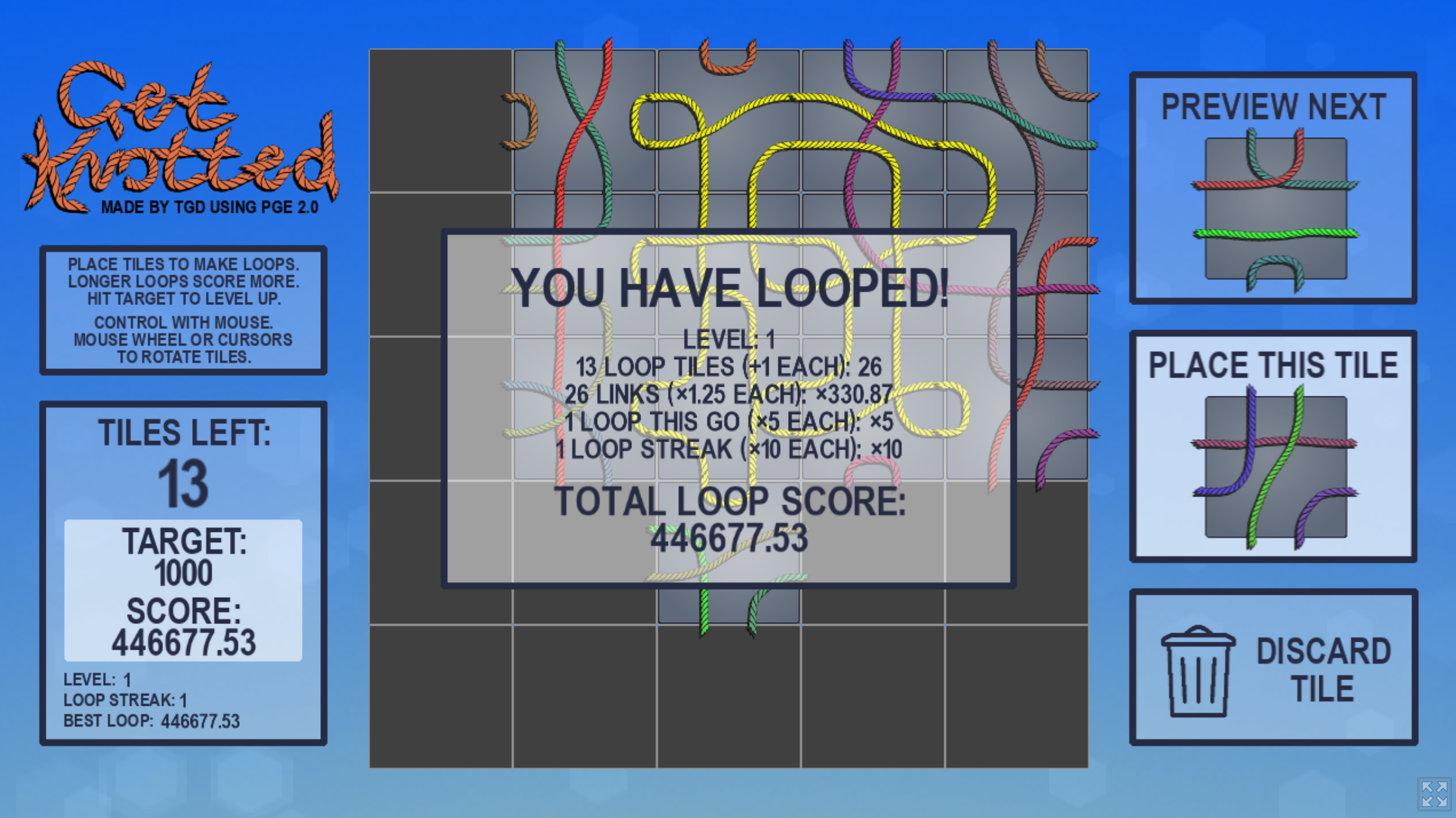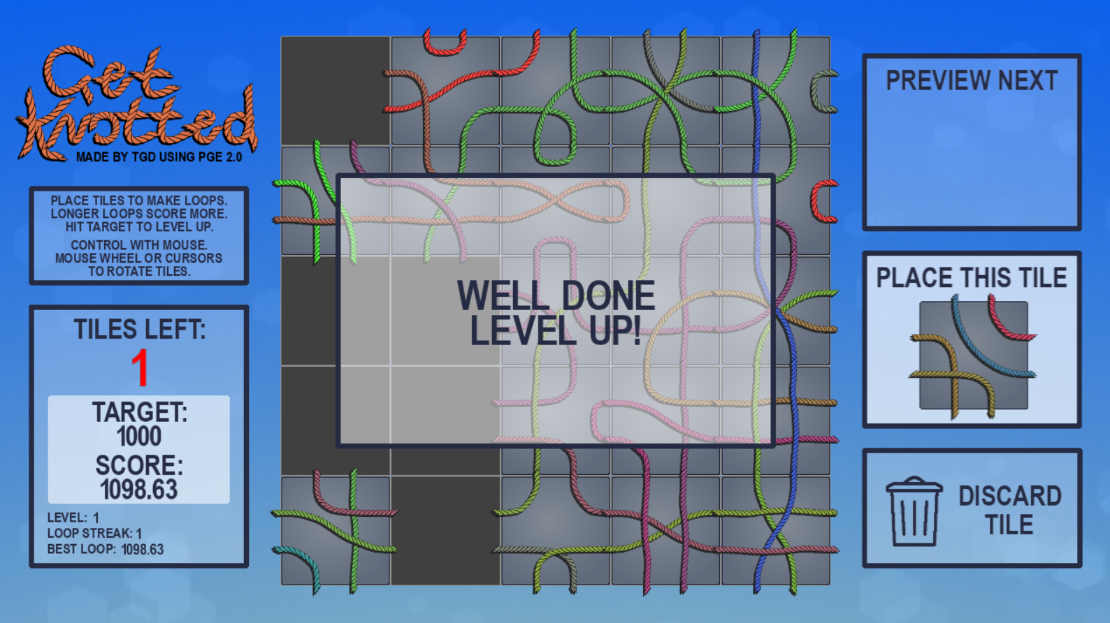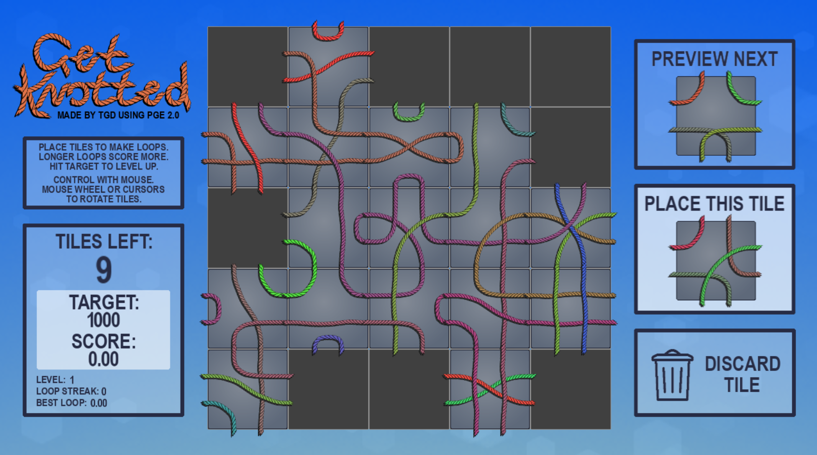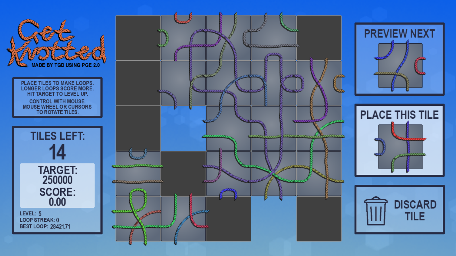 Such a great concept, highly addictive. Would be awsome if the game left You use all the tile before leveling up, as often I had more going on on the map and felt a bit disappointed that I couldn't loop some of the prepared knots! :( Very cool game!