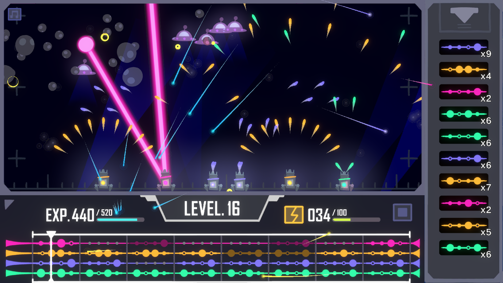 This is some insane music game, definitely the most fun one I'v played so far. I rlly like the different combos of music, however I can't do much to defeat the enemies I fear and moving them around isnt the most efficient way, it will also be more satisfying if I can see how much blood is left for the ufos. Overall such a cool game tho! Music rock
