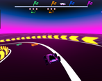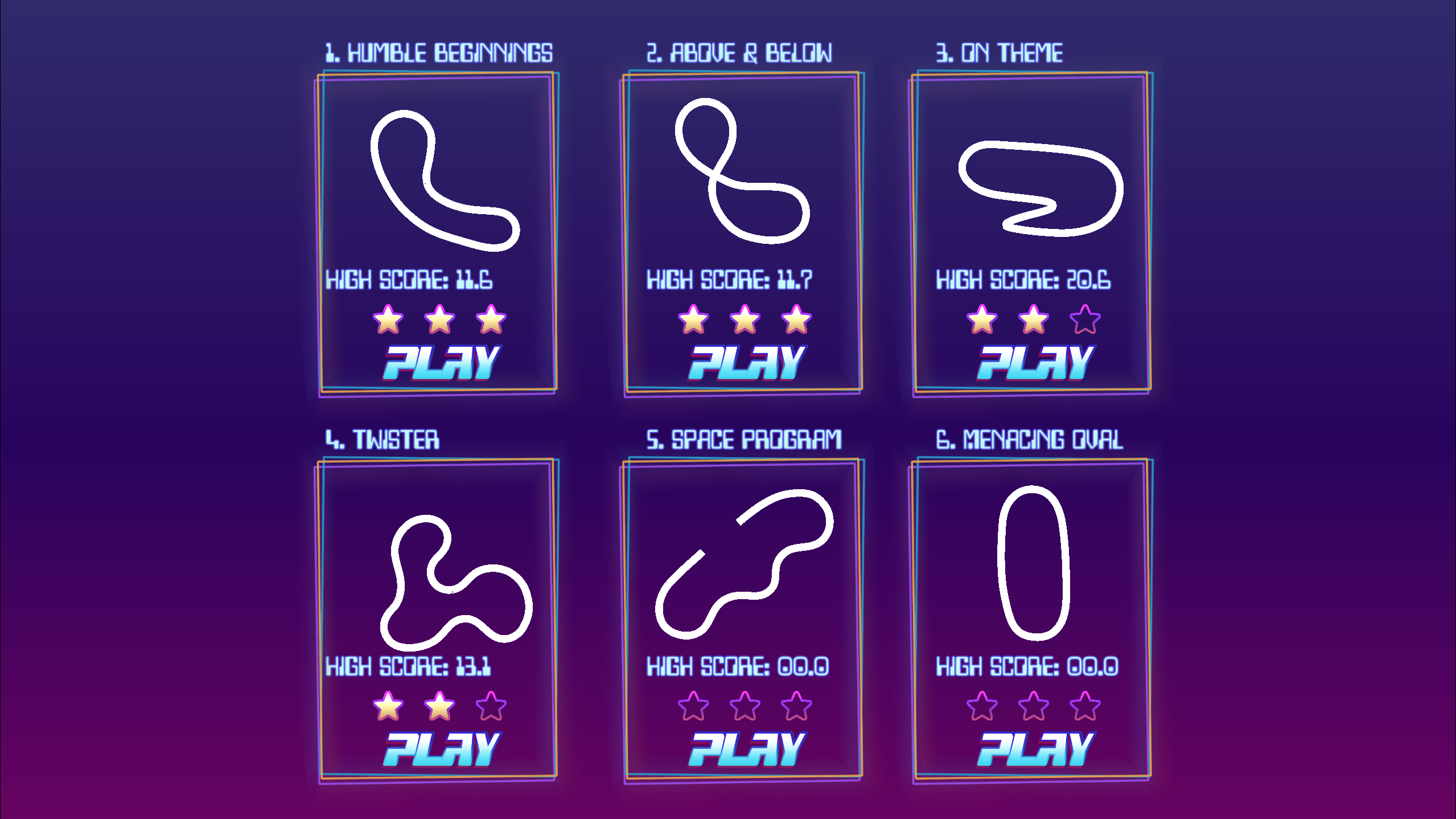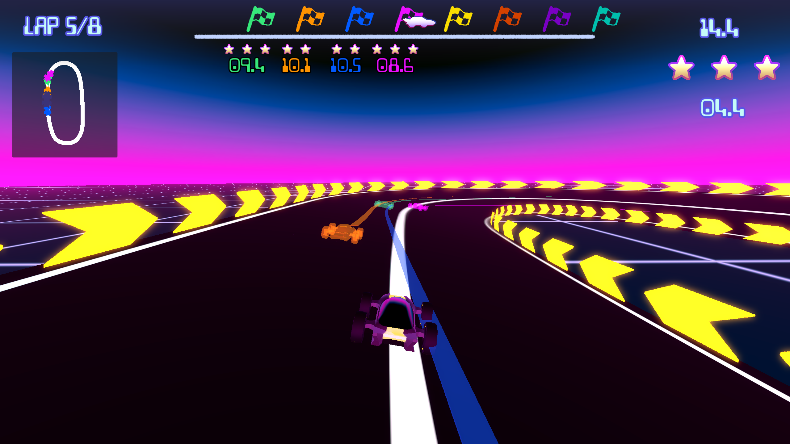 Love the synth wave atheistic I think it matches the idea fantastically reminds me of that one Futurama episode whare someone is driving in like Tron space and they get split into into the rainbow. Its so fun how as you go on it just gets more and more chaotic especially if you are doing good laps and all your cars are in the same spot on the lap. I think some indication on when your ghost cars become solid would be nice because I noticed for the first little bit of a lap they are non collidable but then become collidable. Fantastic game I had a lot of fun playing this one.
