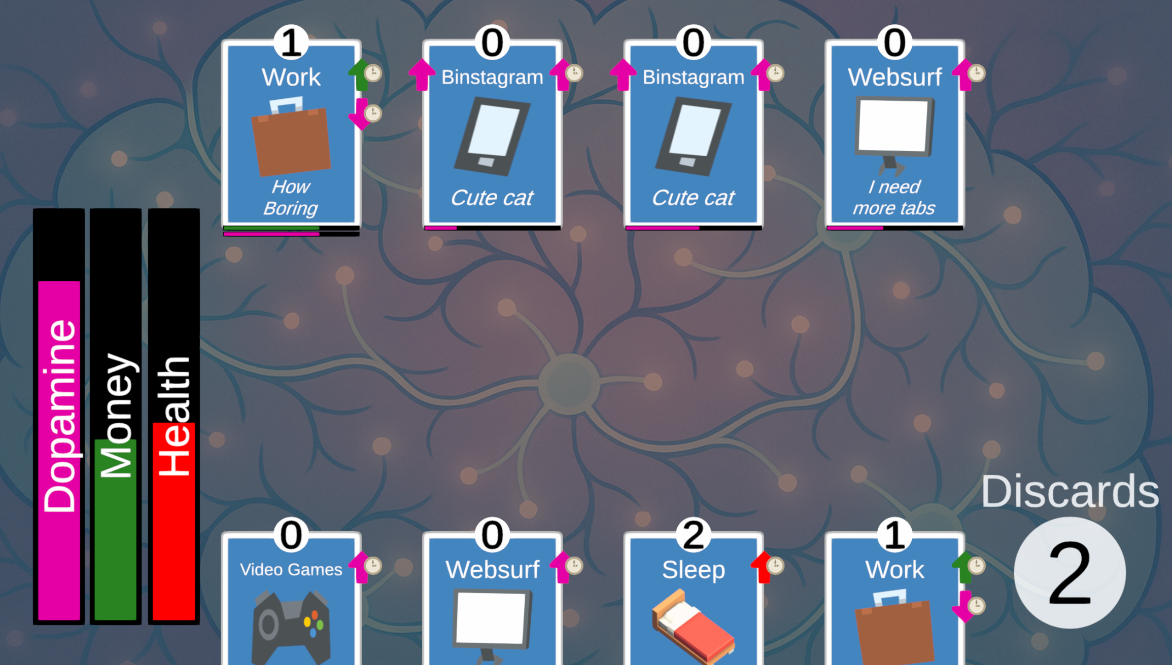 I enjoyed trying keep the three bars from crashing. Got my dopamine to a high 9 before crashing. I could envision some card types that encourage you to keep them in your hand and build power over time, or that combo if played one after the other. Nice junkie art.