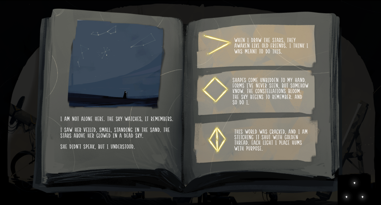 Well, I think this is the visual novel of this year's jam! Congratulations, the visuals and sound are absolutely beautiful and relaxing. The way each constellation we draw reveals a bit of the story is really impactful. It kind of reminds me of the Ghost of Tsushima haiku sections, where we reflect on the story events and the player's emotions.