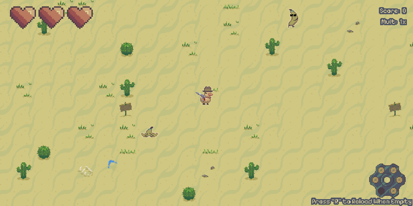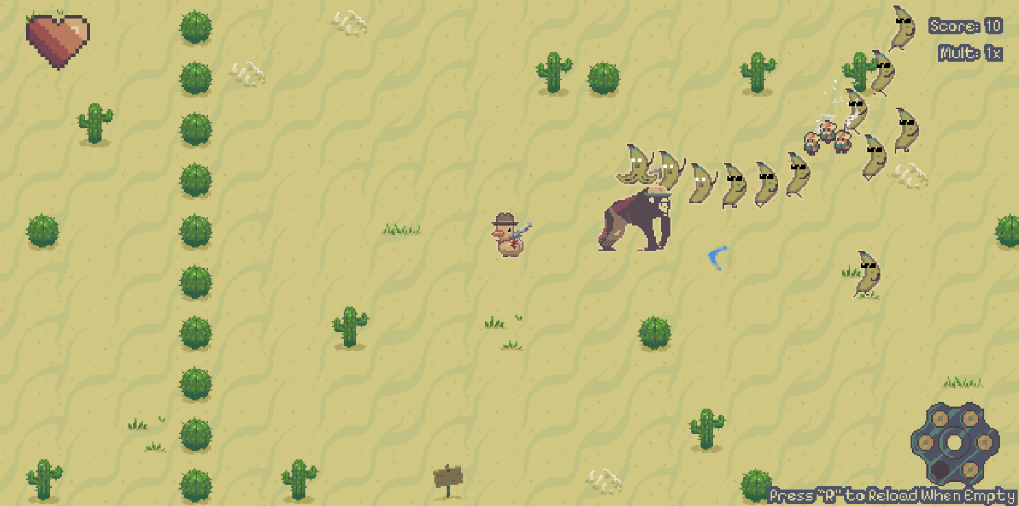 I loved the art style and I like the boomerang physics, the only thing is that I found two bugs (infinite bullets without reloading and some banana hitboxes doesn't work sometimes) but overall looks good :)