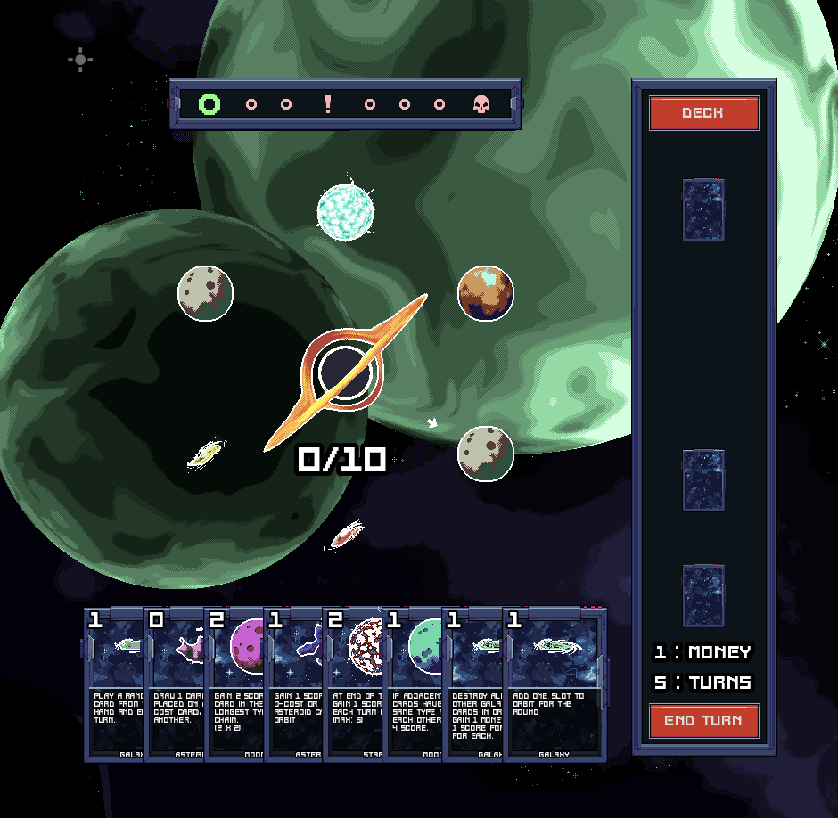 Super sweet art design! Really loved how the music perfectly fit the atmosphere too! The concept of playing cards in a circle around the black hole was pretty clever as well, it was fun to figure out how to make use of it!