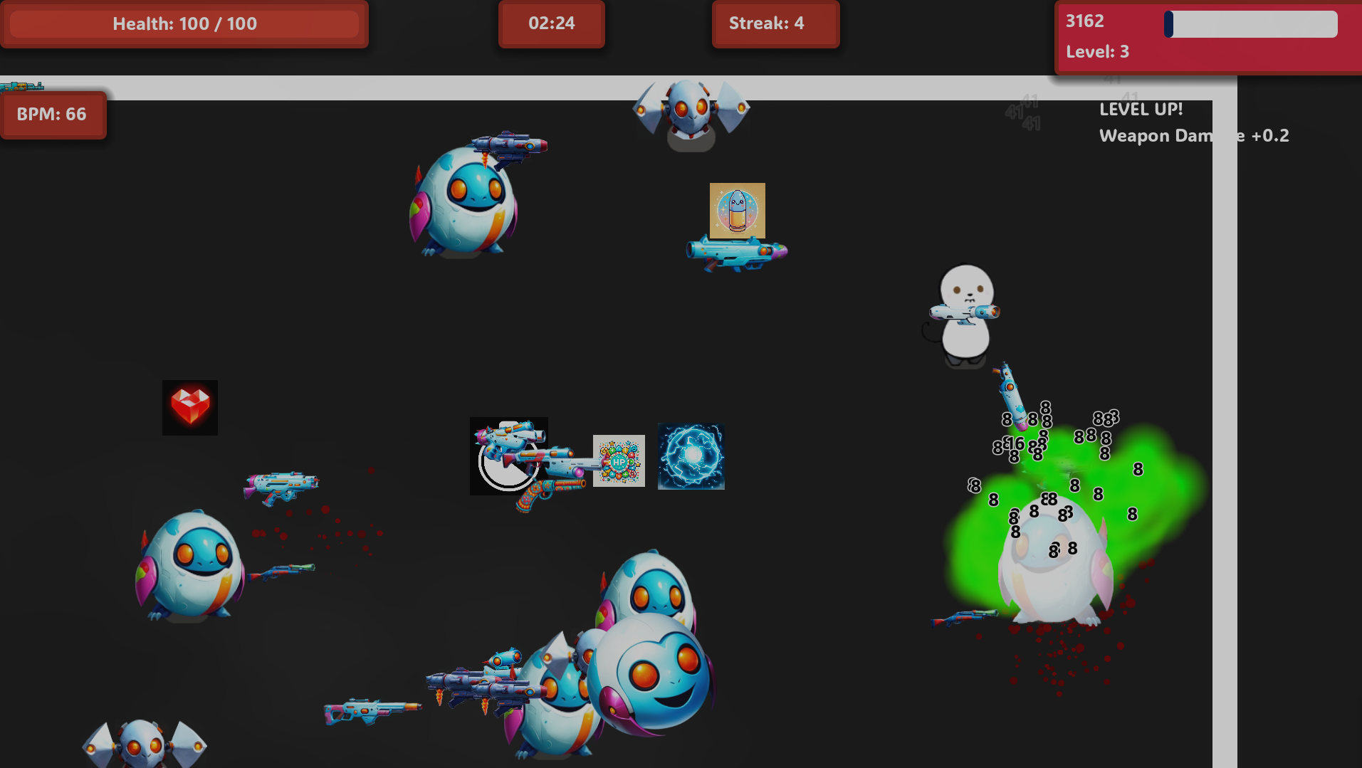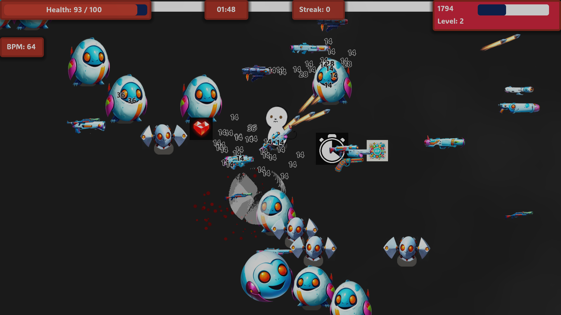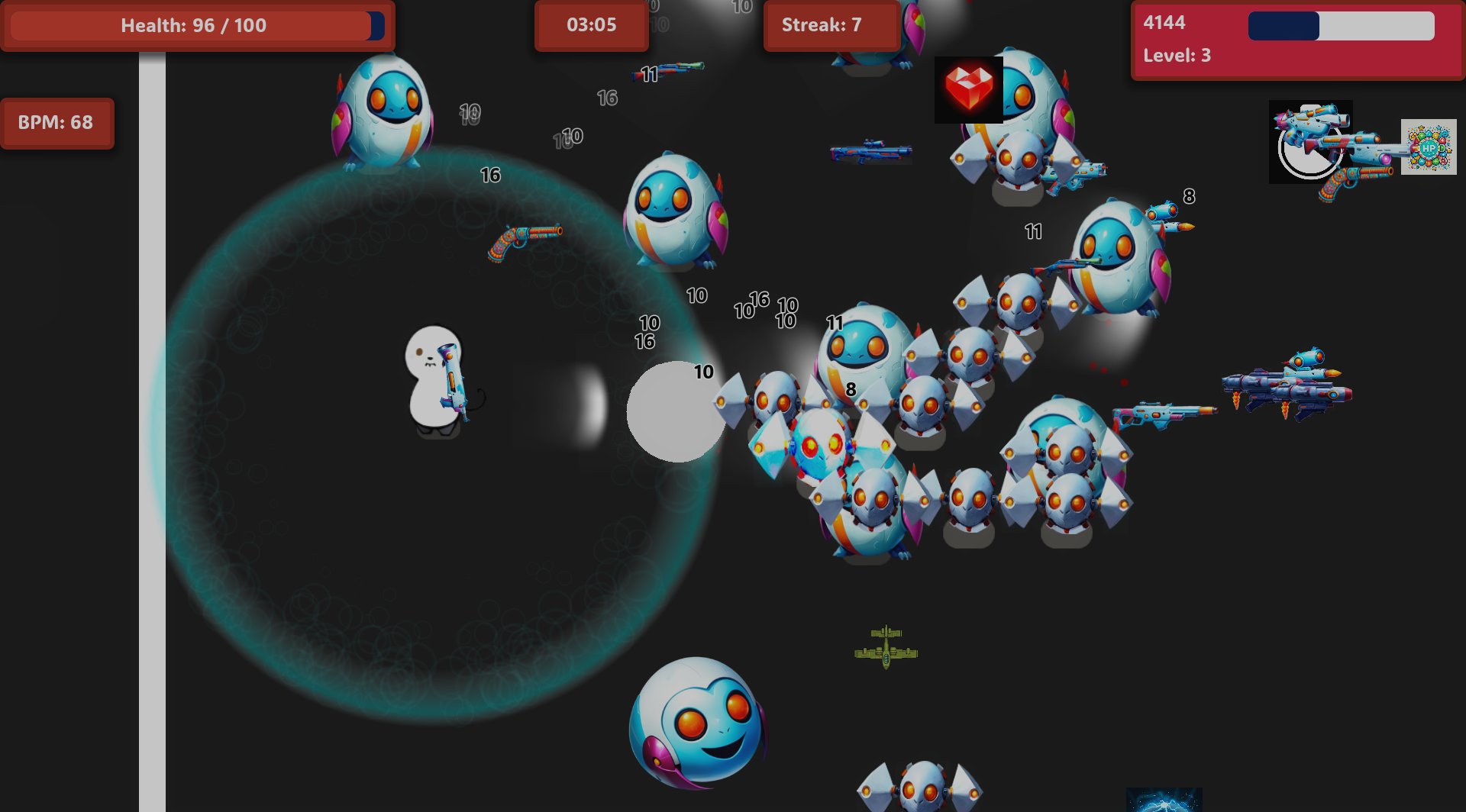 Really nice and creative game! It felt kinda like "Vampire Survivor" mixed with "Crypt of the Necro Dancer", it's a really neat concept. The music music is very fitting and the timing to the beat is nice and lenient. Great job making the game.