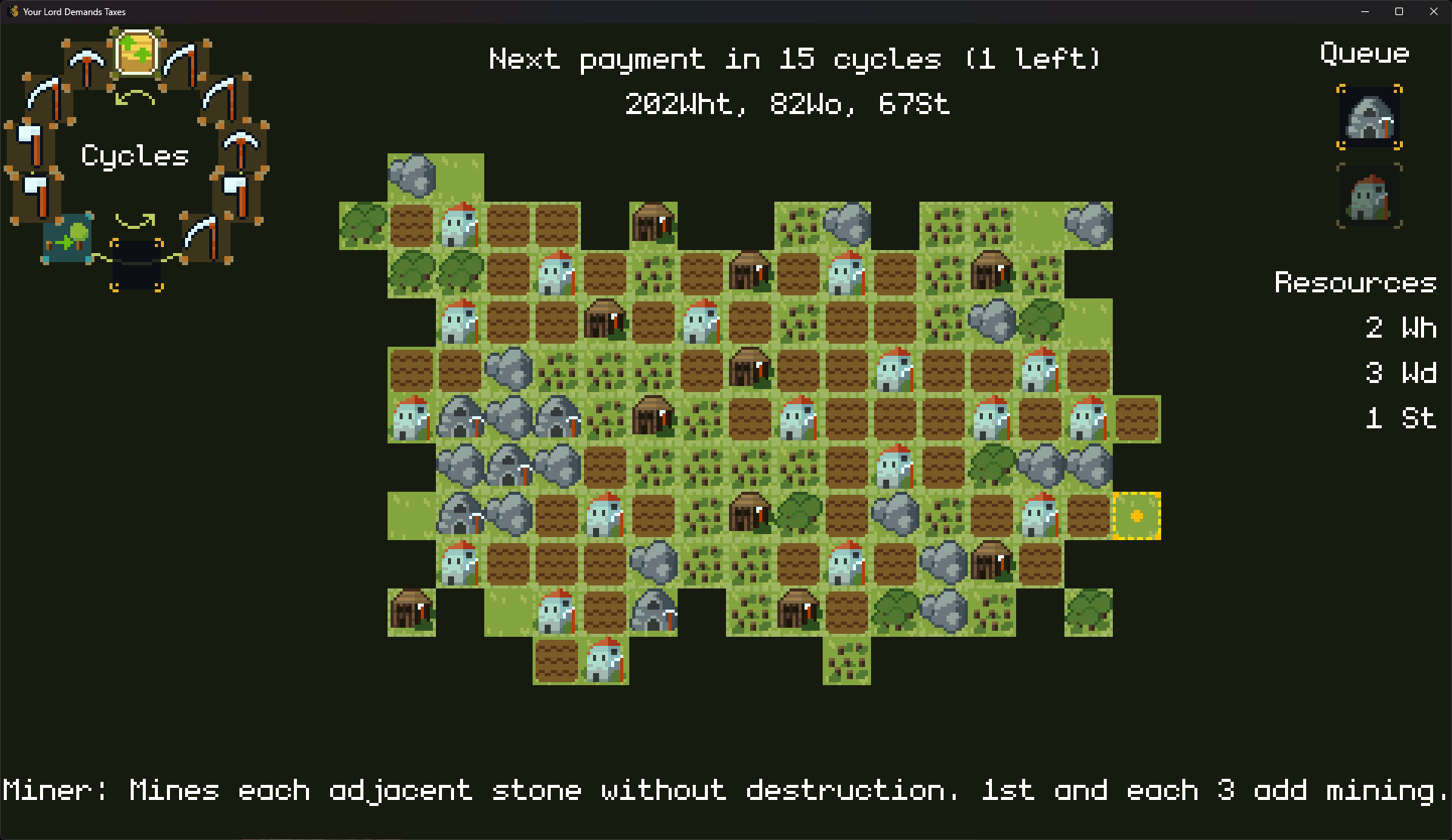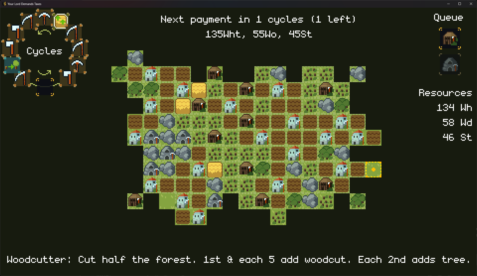 i think it would be neat for the game to have some form of demolition building/crew (could be one-time use maybe) which adds a demolish tile action to the cycle. it would help add a bit of leeway for players to slowly modify their land layout in deeper runs when things get overpopulated, which i think wouldn't be too over-powered/abusive since it would add another action to the cycle thus delaying actions even further. also i felt like you quickly gain too many duplicate actions which ends up becoming harmful after the gaining your second action of the same type since it seems like you can only ever have one action where resources grow back in a run. other than that, the base concept is great and i can imagine seeing how this can expand into something super cool! congrats on the submission!