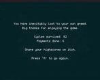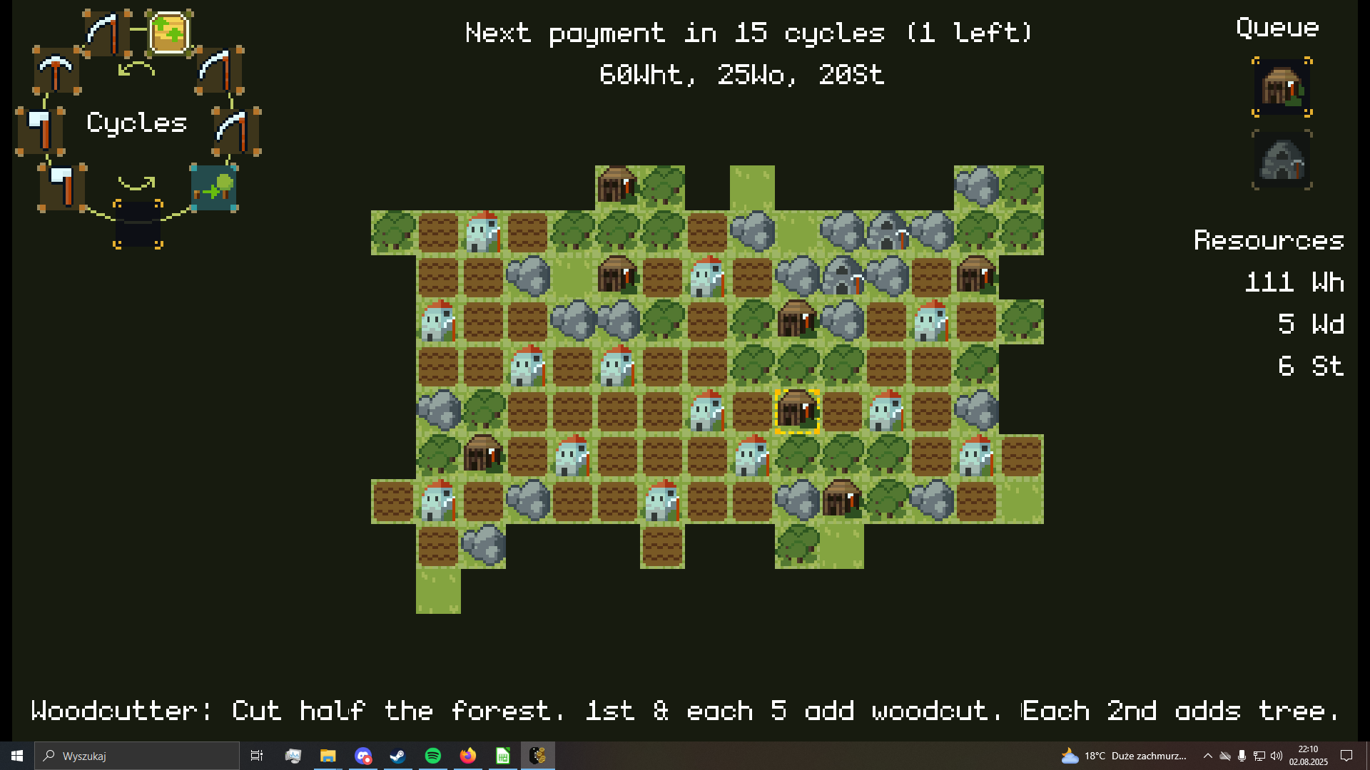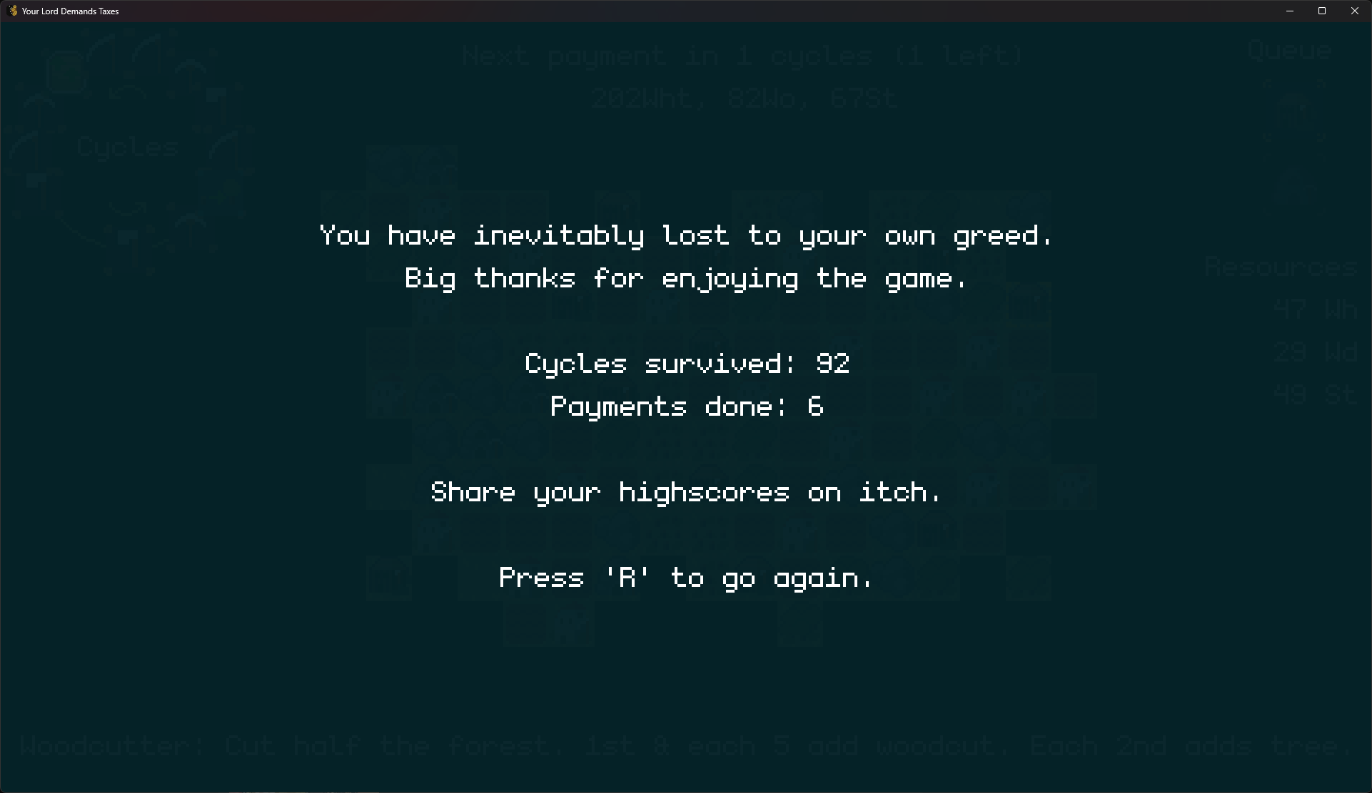 wow this was super fun! took me a while to get a good handle of how to best make use of each cycle, but once it clicked i was able to enjoy it immensely! i found the early game especially cool as the random generation of resource placements and available space makes you really think about your first few turns and how to build a good foundation for resource generation later on, which is super cool! unfortunately i learned the existence and importance of skipping turns too late into my winning run as i was just placing buildings every cycle which didn't pan out too well in endless mode 😅.