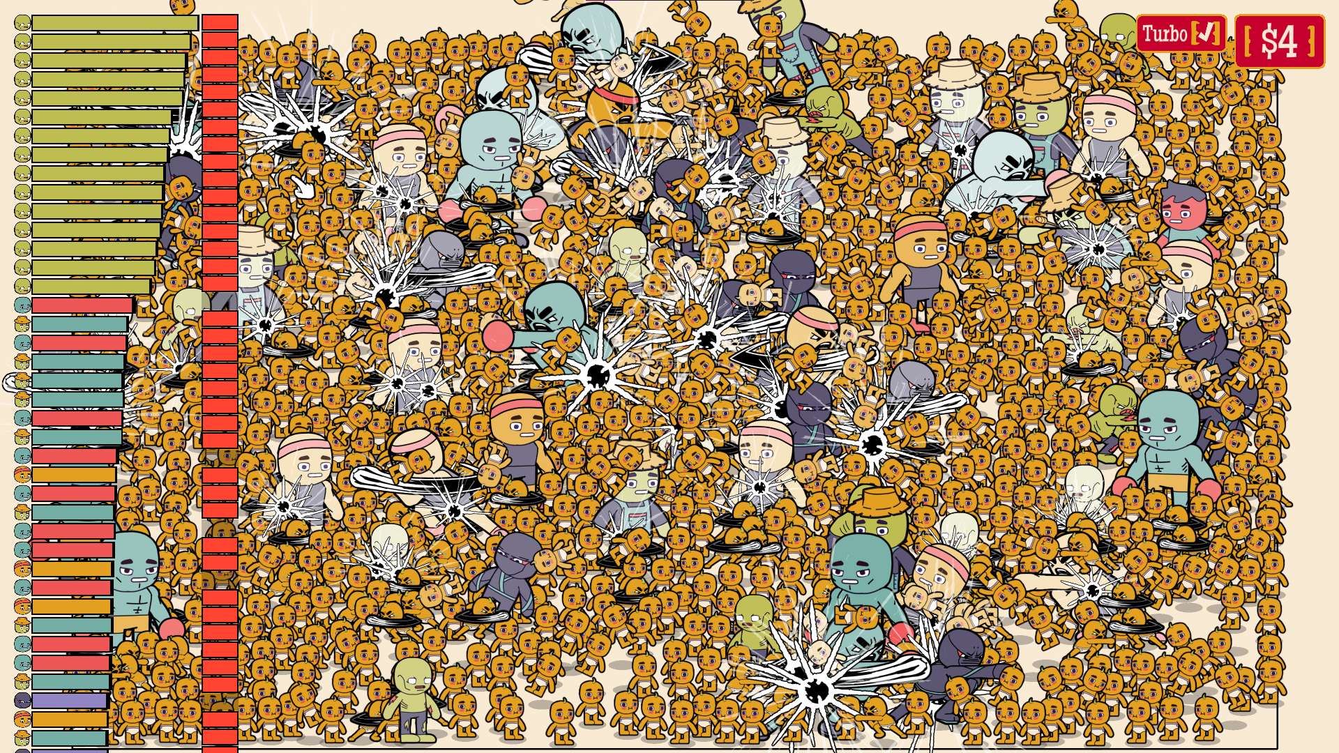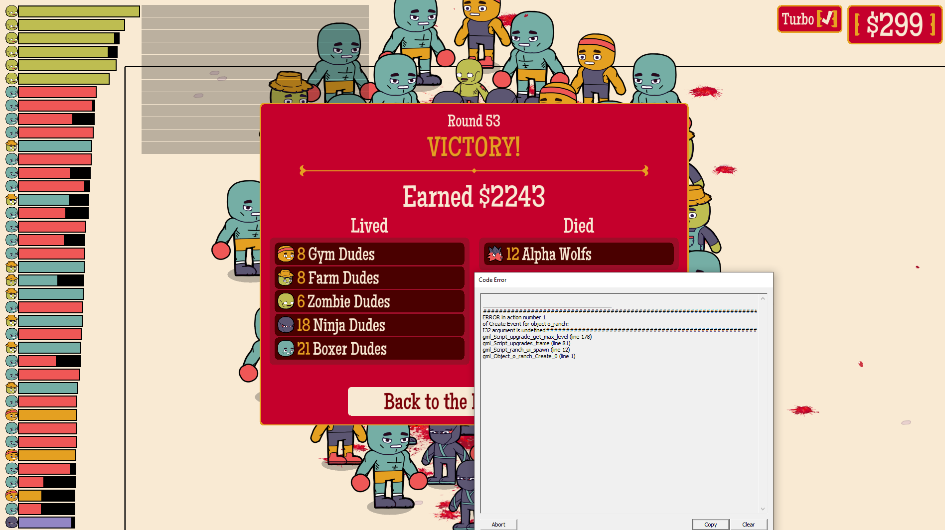 I thought the 100 guys vs one gorilla would stay a hypothetical but I'm very happy it didn't. Amazing game. My save game is broken and I cant progress after round 56.