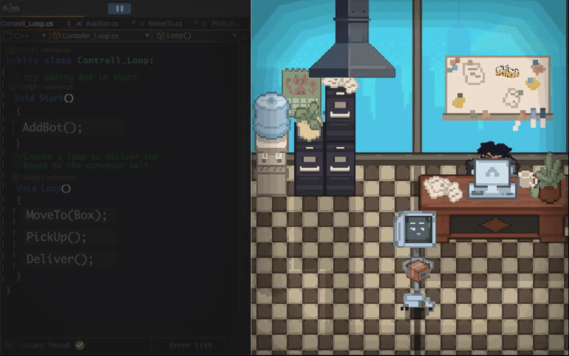 Cool game I liked the theming and it's fun to play. I wish there was more explaining the text and that the camera followed your bot as he kept running off screen for me and I'd have to chase him with my mouse, but great art, it's a fun little puzzler, especially because I'm not a programmer aha