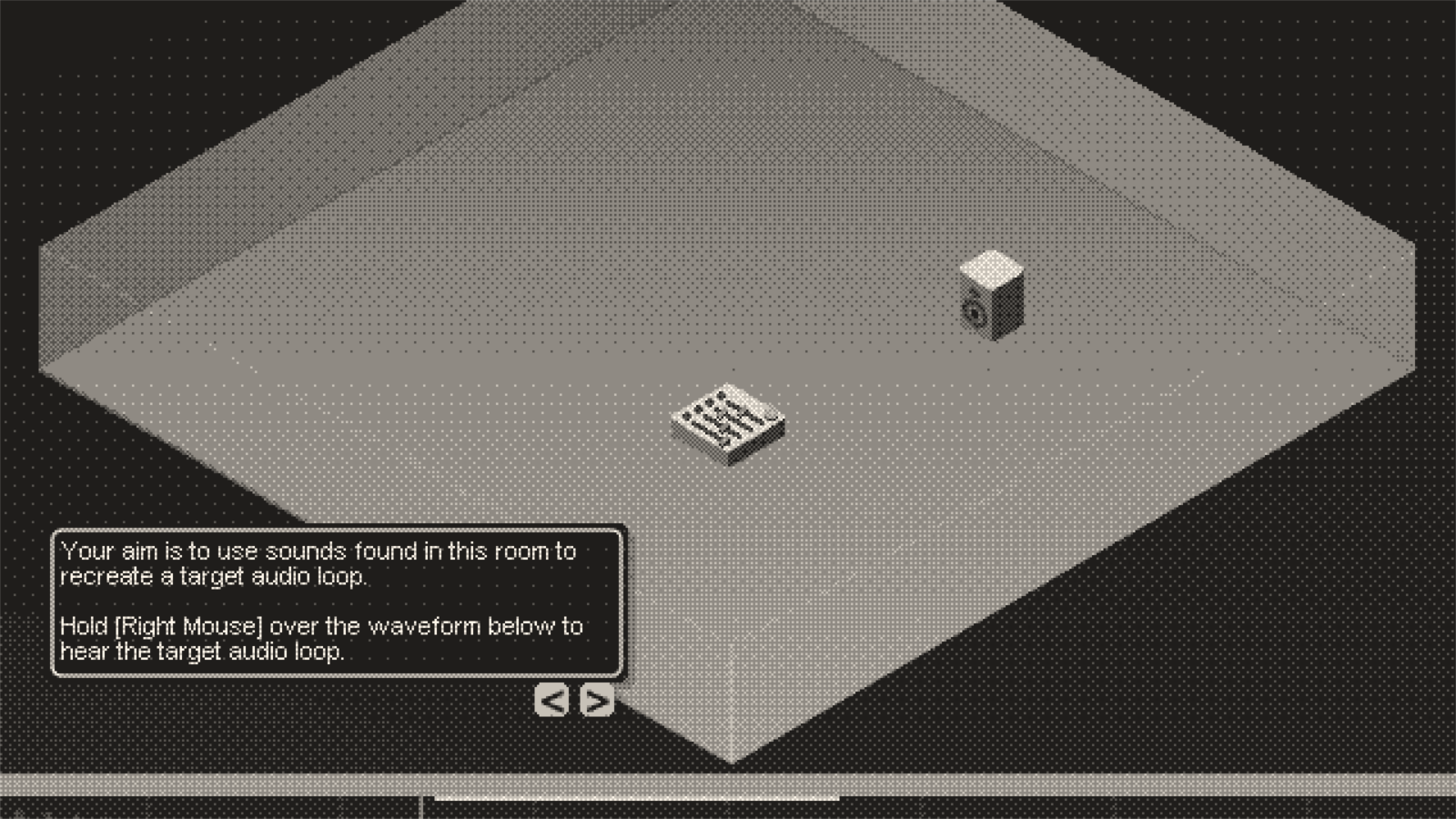 The game takes place in a 2-second long looping audio environment, where your aim is to record, chop up, and manipulate found audio into resembling a range of drum loops.