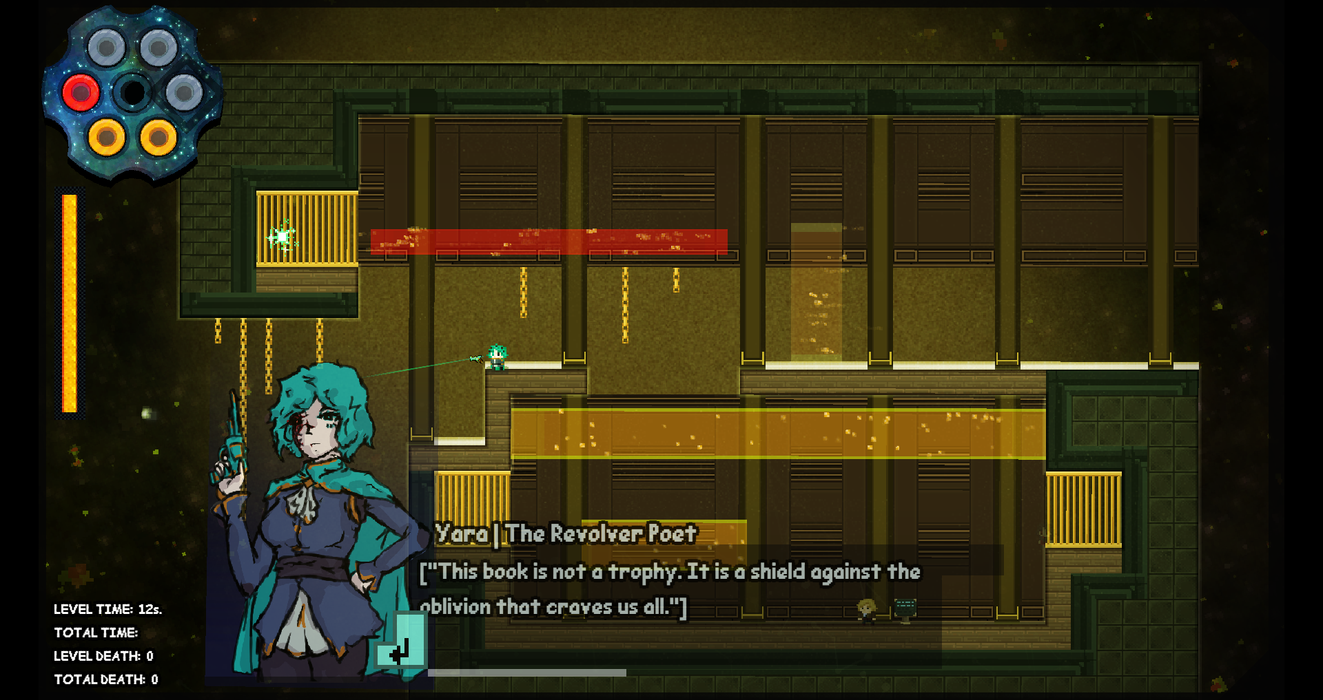 This game is really good! Mixing a platformer with a revolver that allows you to change various things in the level is very creative and could lead to a lot of fun interactions. On this note, one thing that I really recommend for game jam games is to make it so you can play every level from the start, rather than unlocking them, to give players an opportunity to check out everything you made without necessarily having to beat every single level.