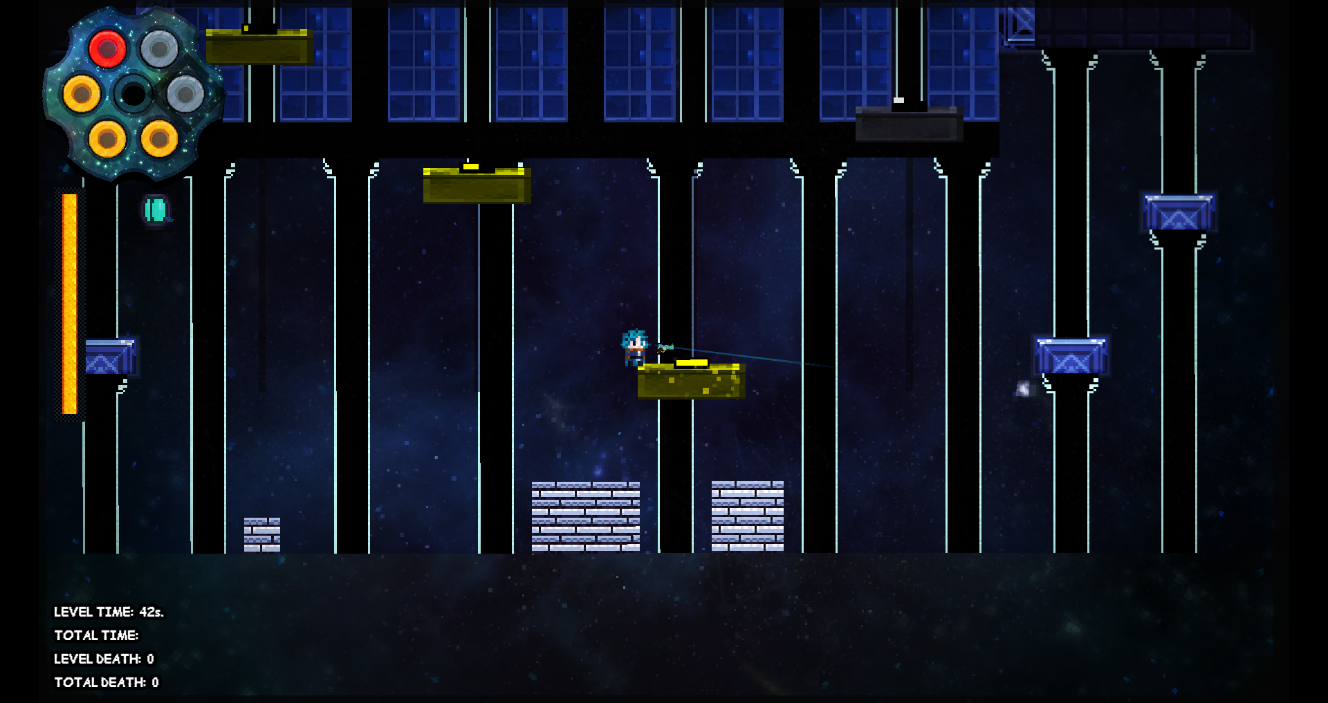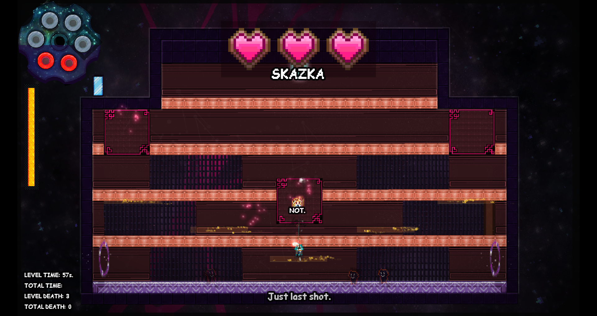 Feedback from playing: I wish the reset when you die was faster. And I don't like to see where I died :c just makes me feel like I am bad at the game (which I am but I don't need to be reminded thankyouverymuch). It would be nice to be able to reset without needing to reach x bullets. and a bit too hard at times.