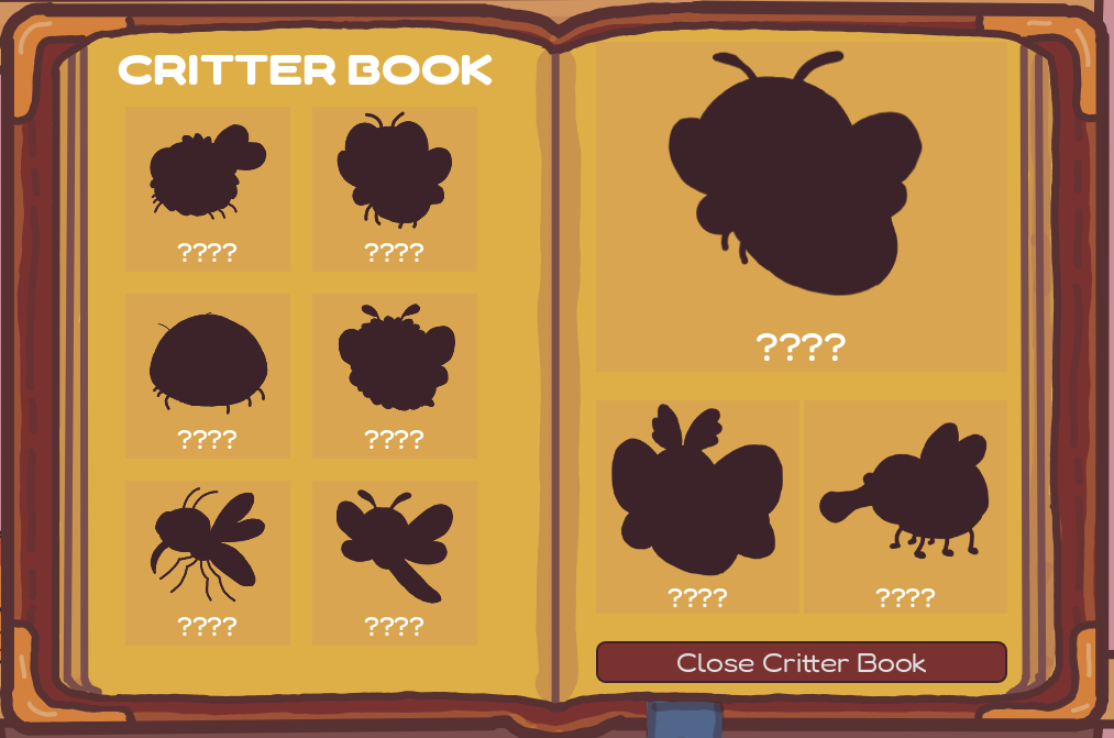 My only critiques are that the big rare bug(the one above the moth in the critter book just didn't wanna spawn outside of the beginning so I unfortunately couldn't catch it, and I wish the tutorial made it a bit more clear on what I need to do. But for something made in just a week this is insanely good and well-polished, y'all did an amazing job!