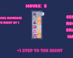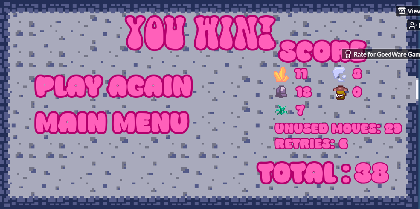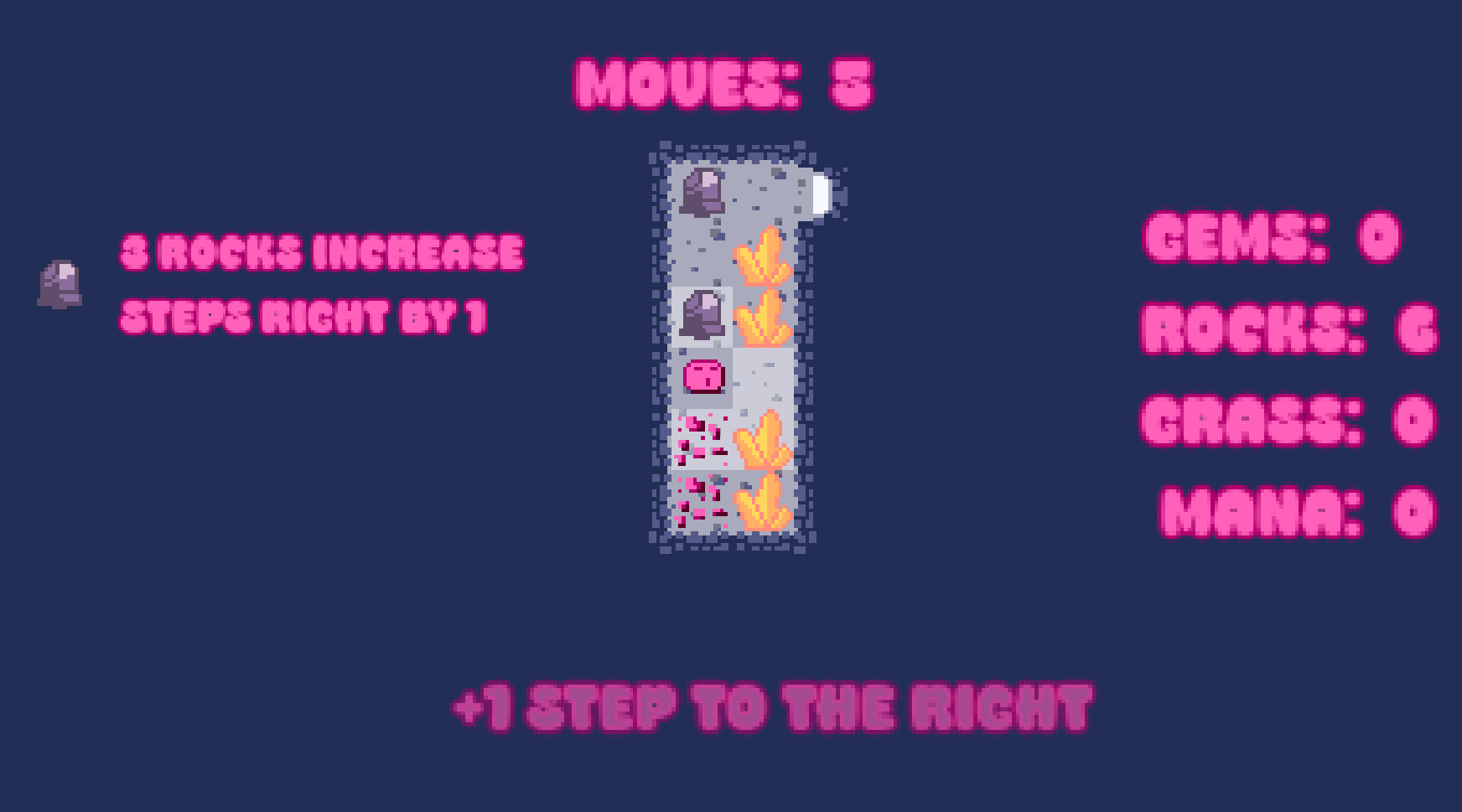 One of the first things that hit me was the creepy music. Was this intended to be a spooky game? I like having the consumable things be a resource- though the powerups that make you able to go 2-3 spaces in one go make the game REALLY easy. Before really figuring out what does what, I had already won, lol. Since the powerups are directional based, having the item you are about to eat be in the direction/shape of the powerup would make it a smidge more obvious (For example, making the shape of the crystal be an up-arrow shaped crystal). also passing through the mushrooms gives you an additional turn? took me till a second playthrough to realize this. Pretty neat puzzle game, would be awesome if new enemies got introduced