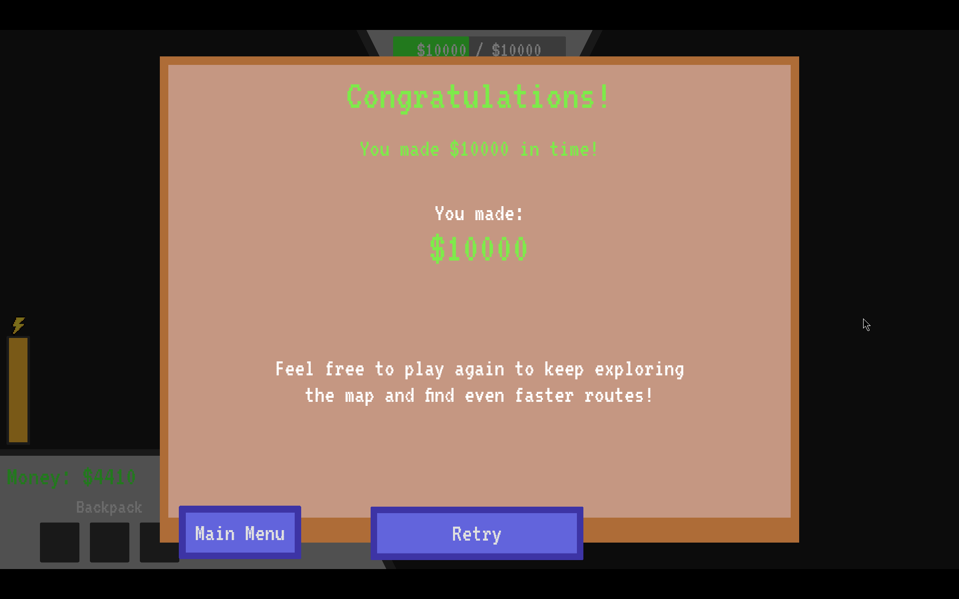 I don't have many suggestions, but maybe some form of progression or upgradability to enhance the strategy aspect even more? Consider allowing the player to trade some of their hard-earned cash for a strategic backpack size upgrade or a speed boost - the possibilities are endless.