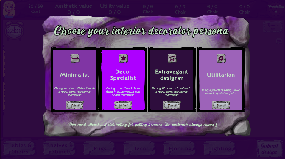 The variety of furniture is awesome and I enjoyed unlocking new things as I progressed in my career (shout out disco lighting). I do wish I could have stacked items on top of each other (e.g. putting a cactus on top of a wardrobe or a table on top of a rug), and I would definitely recommend adding that if you continue working on the game. 8 directional furniture rotation (instead of 4) was a really neat touch and I appreciated being able to play the whole game with only the mouse, controls felt smooth and intuitive. Also, not a huge deal but the UI felt a little off with the vibe of the rest of the game. The voice acting is a great detail and adds a lot of personality, but I wish the mixing was a little different as its hard to hear over the music. Maybe fading out the music when the voice line comes in and then fading the music back in after could work.