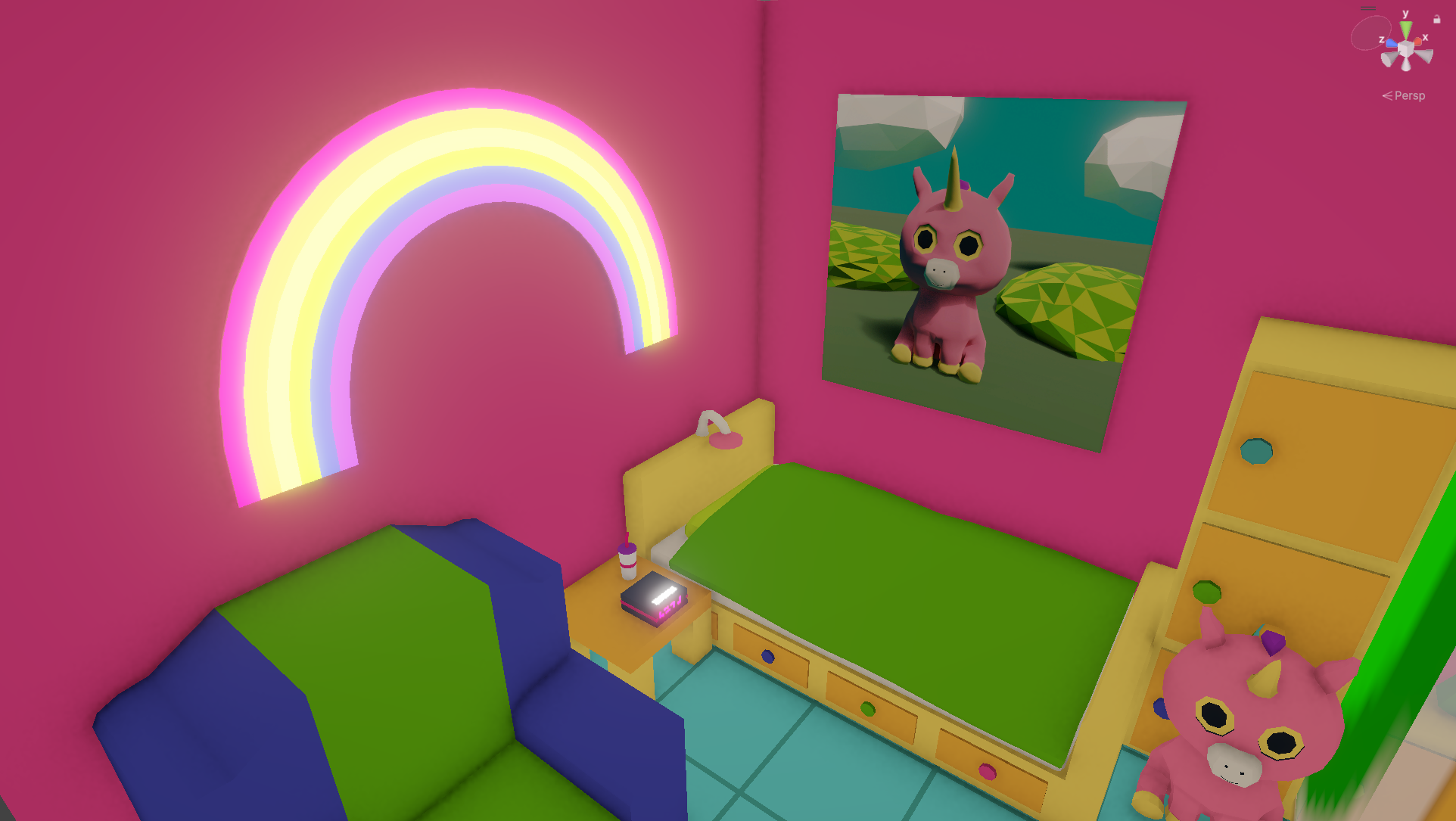 Simple but functional low-poly 3D graphics with bright colors — fitting for the theme. The UI (button colors, layout) could be improved a bit. Using a consistent color palette for the UI would be helpful — for example by looking at Lowspec palettes. Also I would suggest using another font - maybe a bit more playful so it fits the children's room theme.