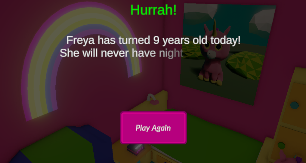 Pretty enjoyable little tower defense game with a cute premise, impressive that you made all the assets by yourself in only 10 days, nice entry!! A 3d tower defense with stuffed animals as turrets was a unique take on the genre, and I really enjoyed being able to manipulate the camera and view the scene from different angles. There's some really nice bits of visual details that stood out to me: the florescence of the rainbow at night, the real time shadows of the nightmare enemies through the window, the contrast of the bright energy beam shot by the stuffed animals, etc.
