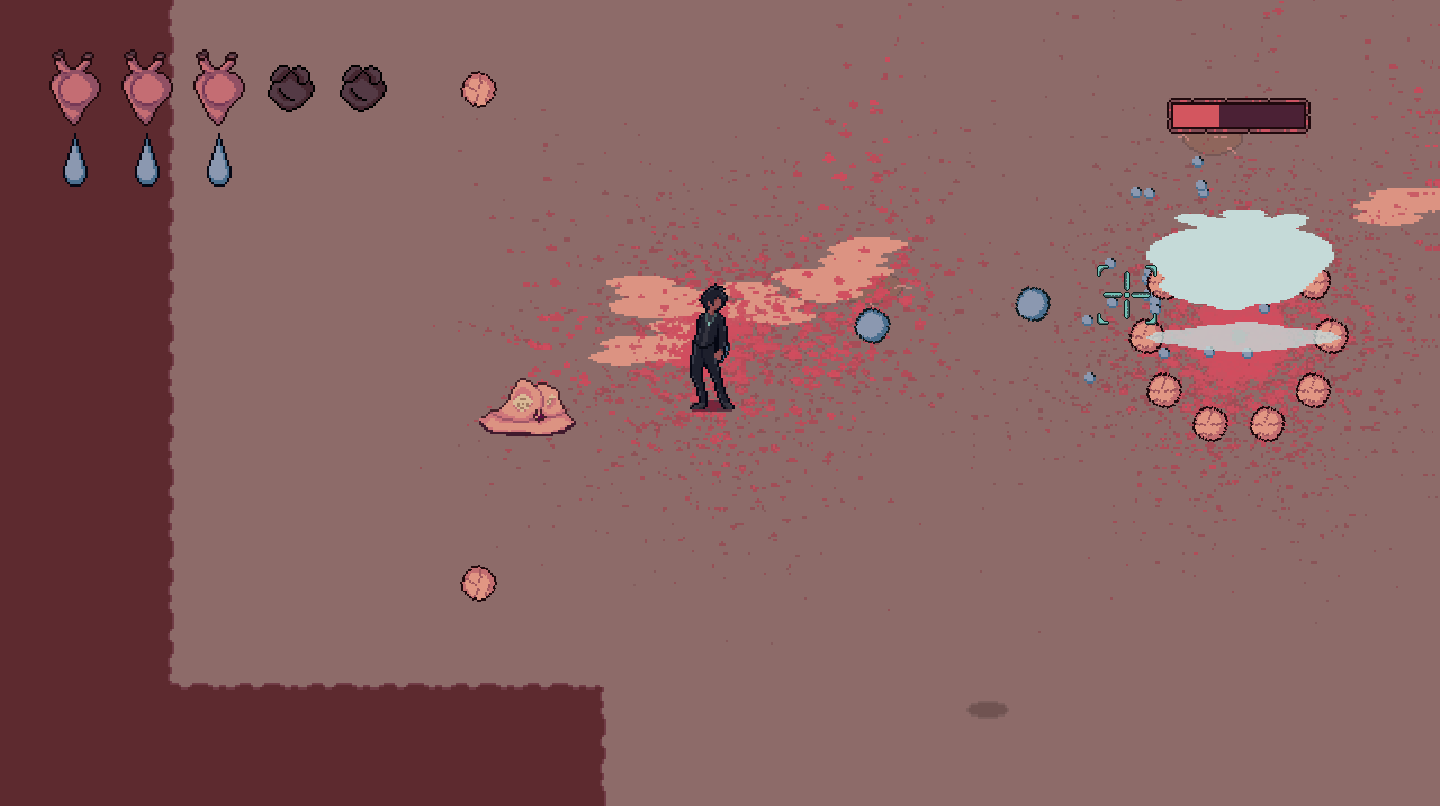 There's sooo many little details of juice: the blood trails of enemies, player death/respawn animations, the short black and white cutscene after killing a heart, etc. It all adds up to a very polished experience. I would recommend toning down the screenshake a bit, since its a bullet hell basically every moment the player is either shooting something or getting hit which makes for a near constant screenshake that gets a bit annoying after a while. The variety of enemies is very impressive and the different attack patterns for each boss kept things fun throughout. The player feels good to move and satisfying to shoot with. I did feel that the player bullets didn't really fit with the rest of the aesthetic, but not a big deal. Also, very much appreciated not having to start from 0/5 hearts after dying, great decision, especially for a jam game.