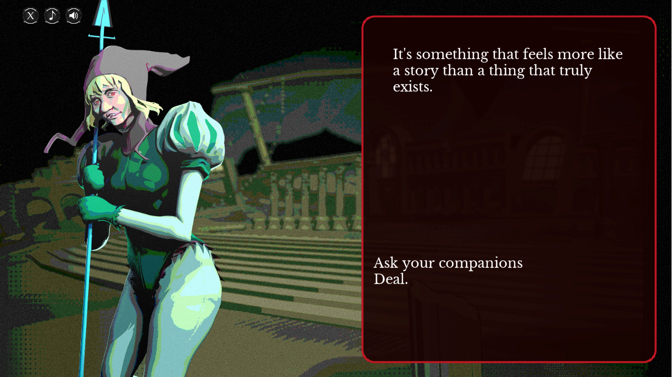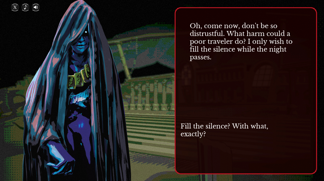 So in short- I loved the artstyle, the fact you used multiple music tracks was a nice touch, and the writing really fit the atmosphere. The stranger was a great character, and it always felt like he had an upper hand.