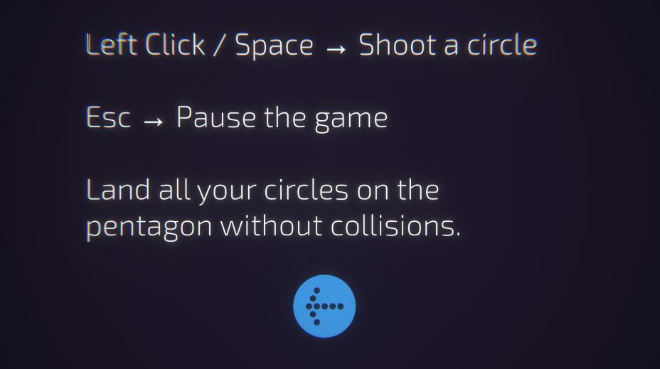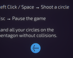 Now for some feedback on the gameplay. It was a little disappointing how much I felt like I could cheese thing by spamming left click. Some levels could be completed by this alone. Most of the other levels would get me down to two or three circles left by the time the pentagon made a full revolution. I think a simple solution that could help with this would be to include circles that are already on the pentagon for some levels and reduce the number of circles you need to shoot. This way you can't just start levels by spamming left click until the pentagon finishes a full revolution. Even just adding one or two circles can force the player to think a bit more before firing off their first circle.