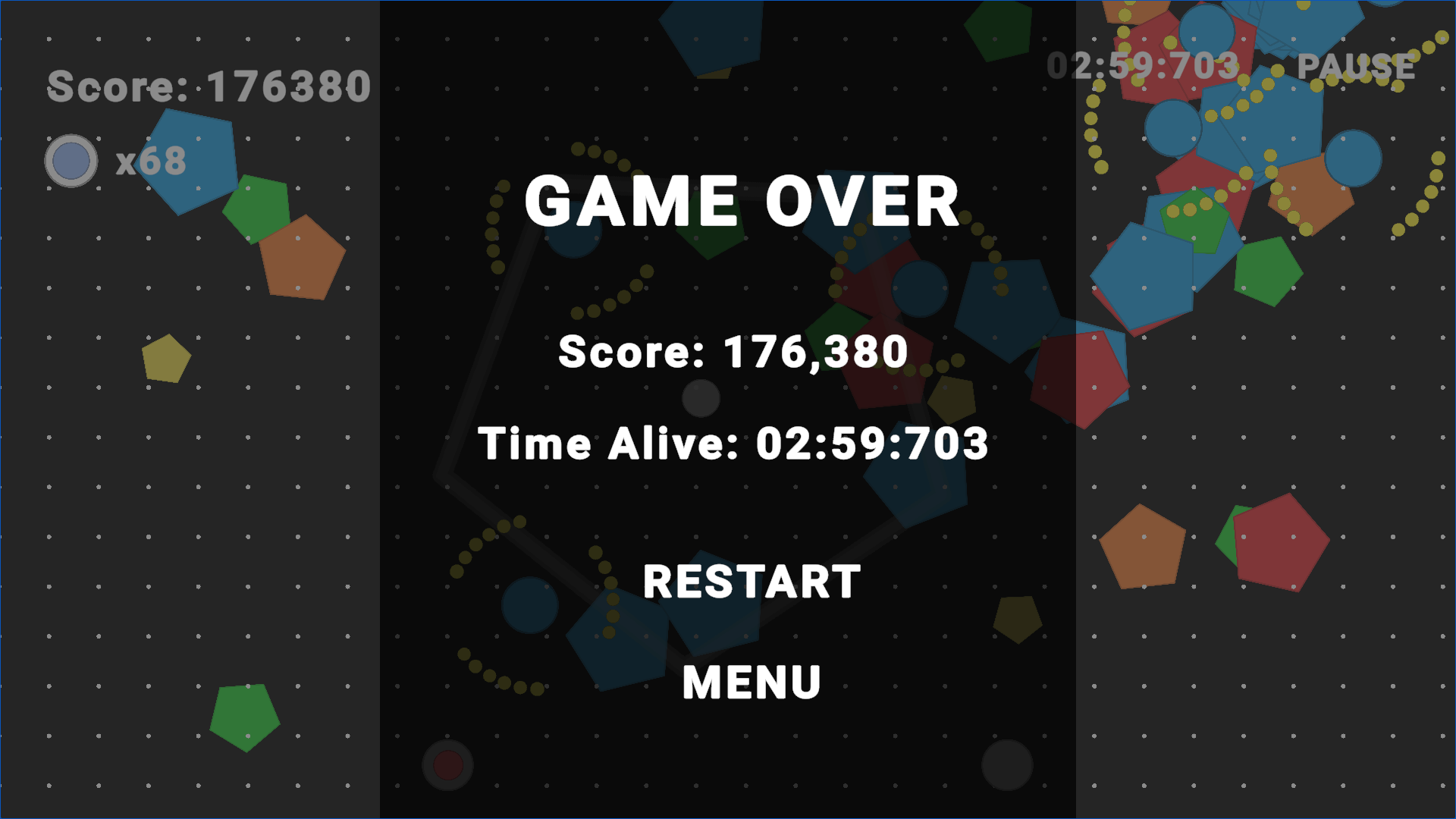The visuals are the strongest aspects of the game. Circles and pentagons are used in a very clean, consistent, and creative way. I especially liked how you incorporated the health bar into the shape-based design. It feels both functional and thematic. This deserves a full 5 out of 5.