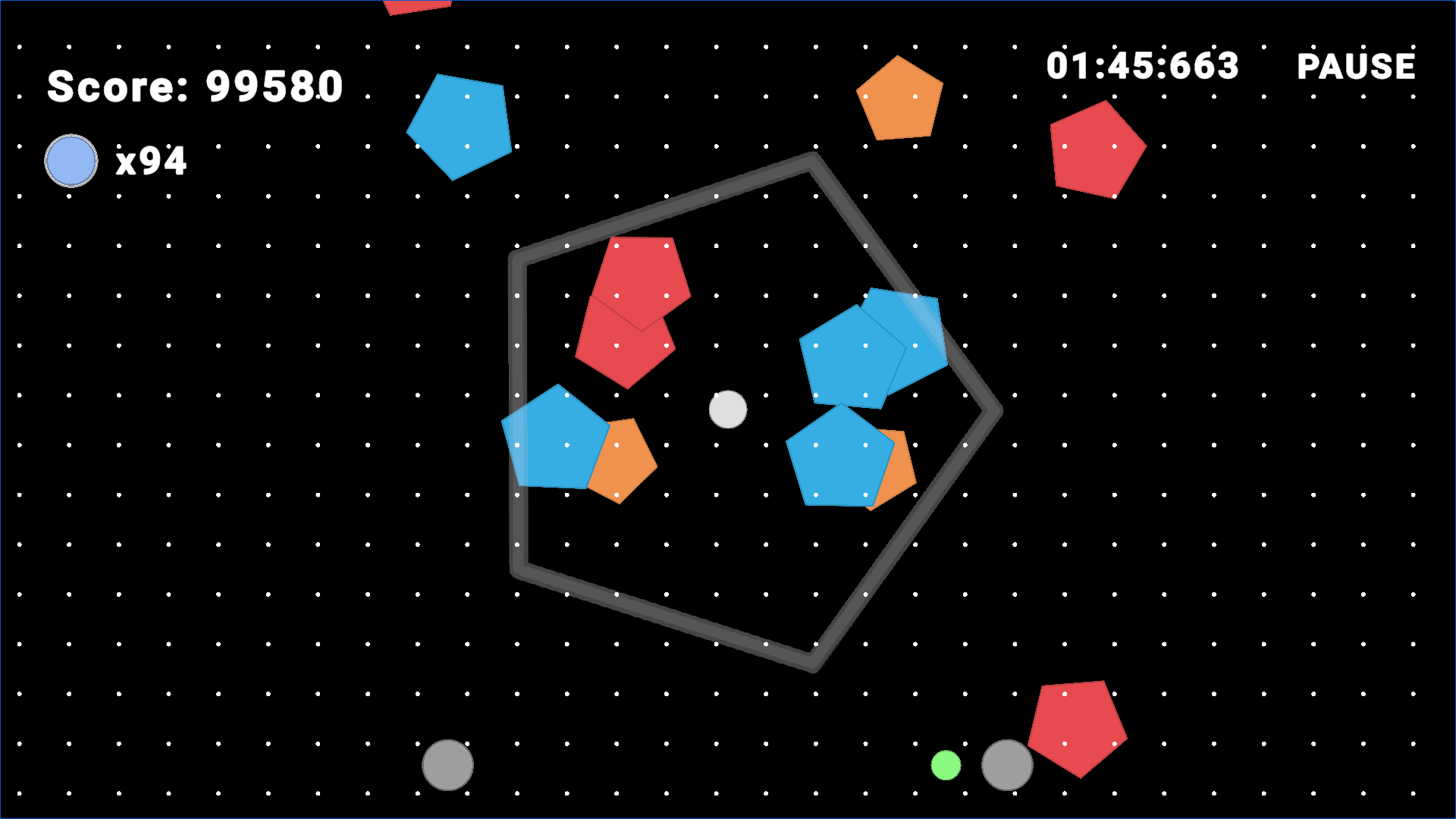 Really fun game, and uses the theme to define the gameplay.. i loved the3 different combos which are also sort of determined by the shape of the pentagon, so really feels quite unique. The progression in enemies is really good, with harder and more enemies coming as the time passes and the difficulty scaling is also quite good. I also liked the popping sound effect, very satisfying :) One thing i might add is to give some sort of progression for the player character (unless ive missed it, please let me know :)) which could be some powerups or level ups. I think that would give some sort of goal to reach towards..
