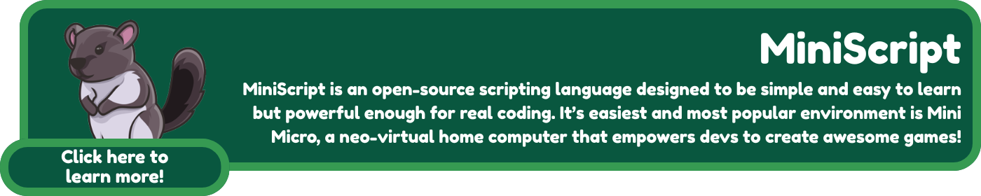 Be sure to add the tag #miniscript in your itch.io page as well as joining our Discord community to let us know you've used MiniScript.