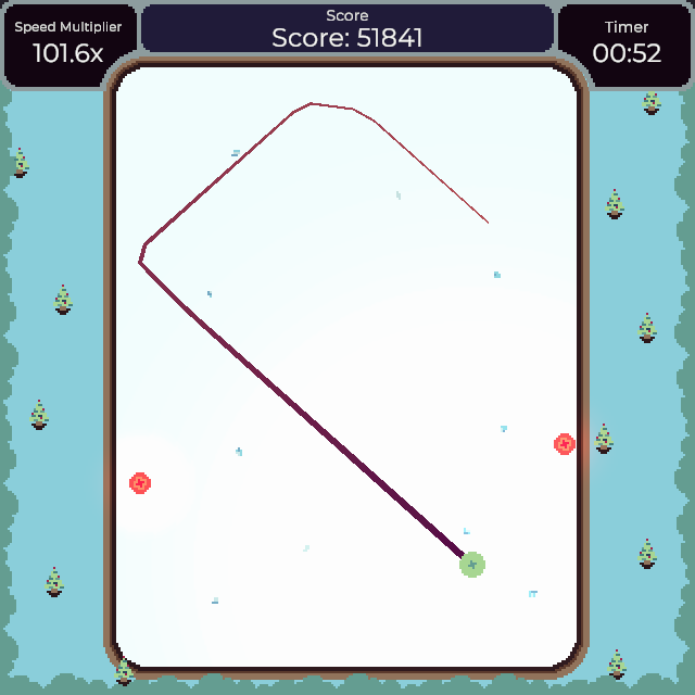 Pretty fun arcade experience, nice entry! The thumping bass hits you right away and fits the frentic nature of the game perfectly. Add in a countdown timer, generous screenshake, crunchy sfx, particle tail, etc and you have a successful recipe for a high score chaser style arcade game. The online leaderboard is a very nice touch, and the mechanic of speed multiplying your score is a great design choice to keep the player engaged throughout. The presentation was well-down but I do think your entry is lacking a bit in the Christmas theme, it feels more like a traditional high score arcade game with some sprites of Xmas trees thrown in the background, than something with a real Christmas-inspired spirit. That being said, I had a fun time with the gameplay loop and you achieved an impressive amount of polish that makes everything feel nice and juicy. Cool game, and keep up the good work!!
