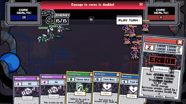 Help him fix the game in time by squashing those bugs and glitches by playing cards, buffing your army of AI chatbots and making the best use of unexpected new bugs opportunities.